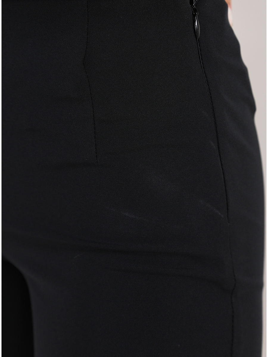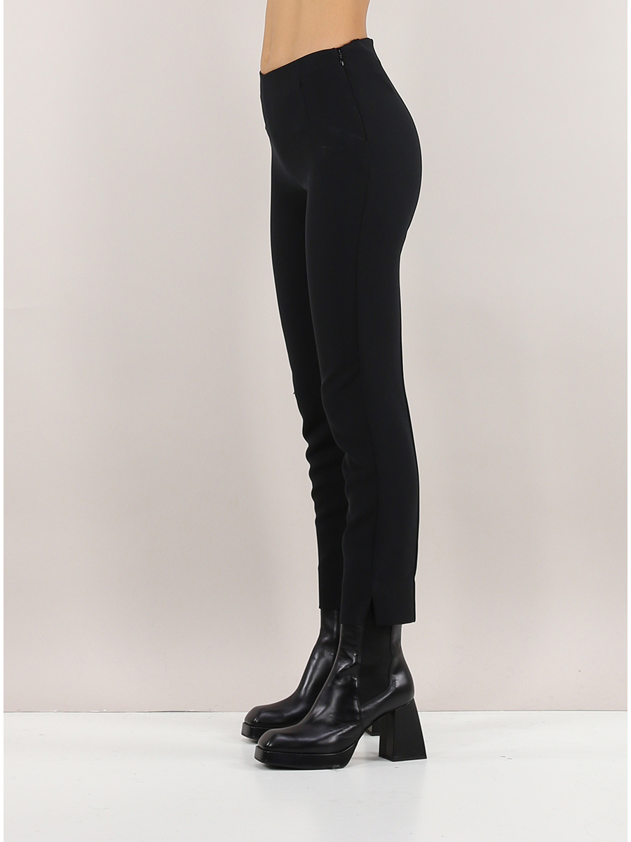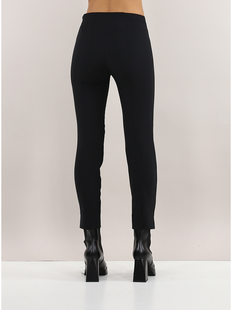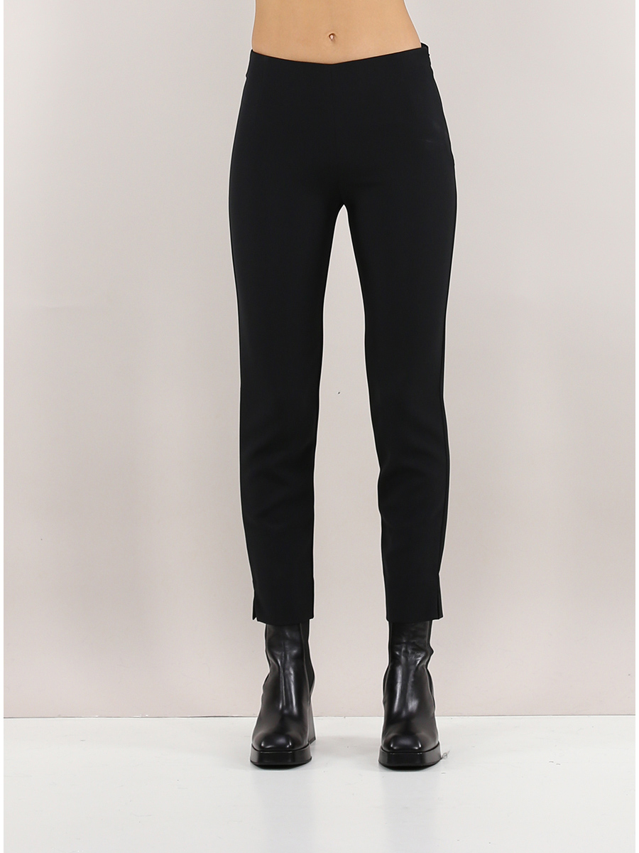Etuihose Malloni mit normaler Leibhöhe. Schlitze an der Unterseite und seitlicher Reißverschluss. Das Model ist 1,80 groß und trägt Größe 40.