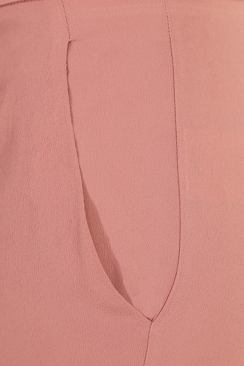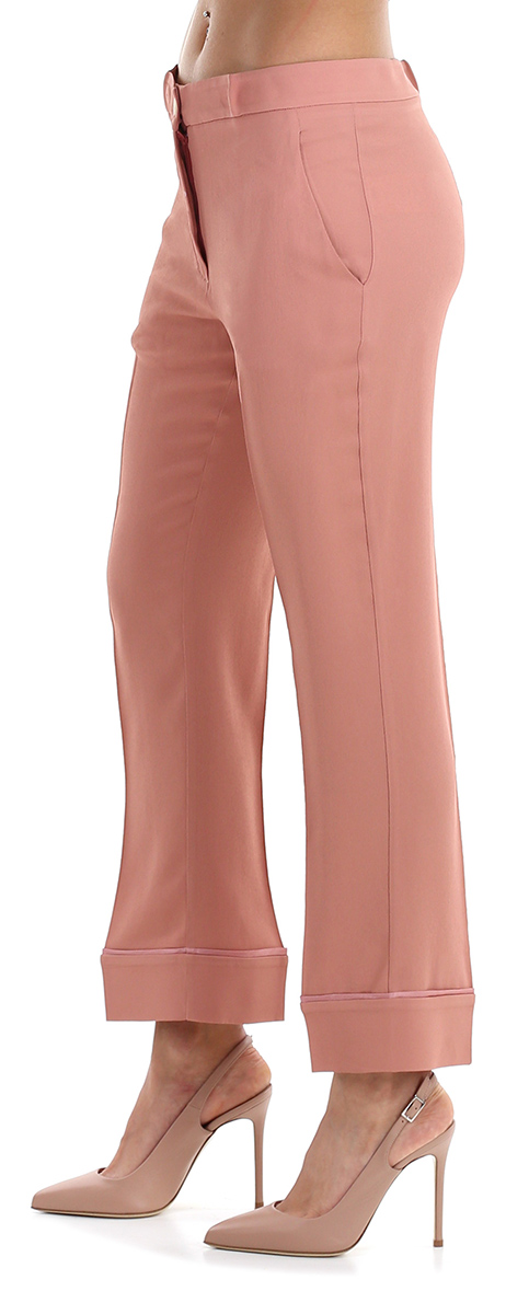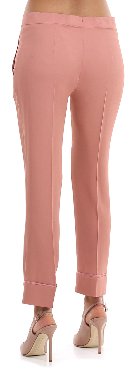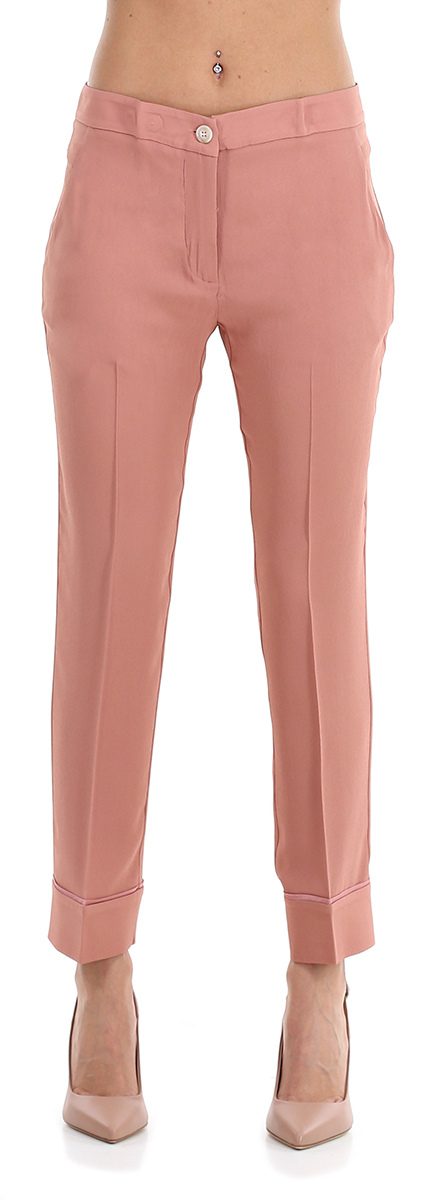 Weiche Hose aus Seidenmischung mit Eingrifftaschen und Umschlag unten. Das Model ist 1,68 groß und trägt Größe 40.