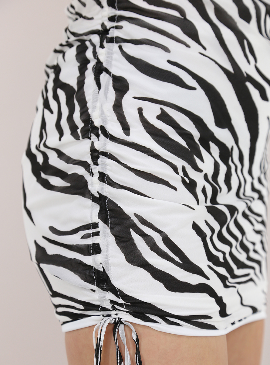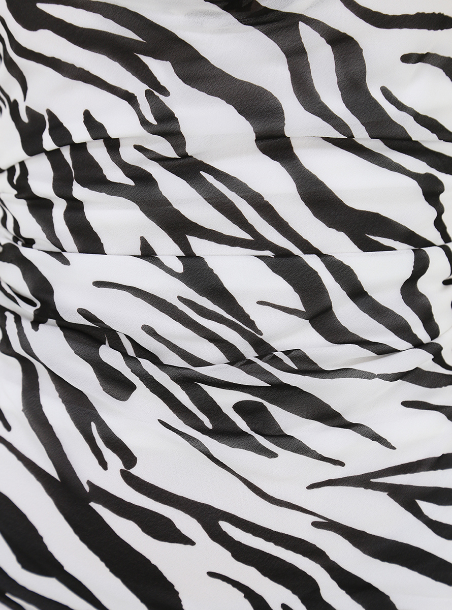 Aniye By Petticoat-Kleid mit Stretch-Futter. Wasserfallausschnitt und seitlicher Kordelzug. Reißverschluss hinten. Tierische Fantasie. Das Model ist 1,70 groß und trägt Größe 38.