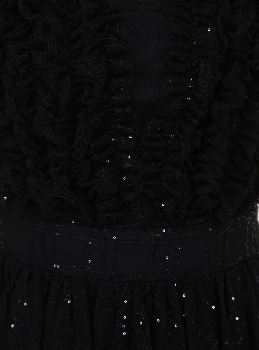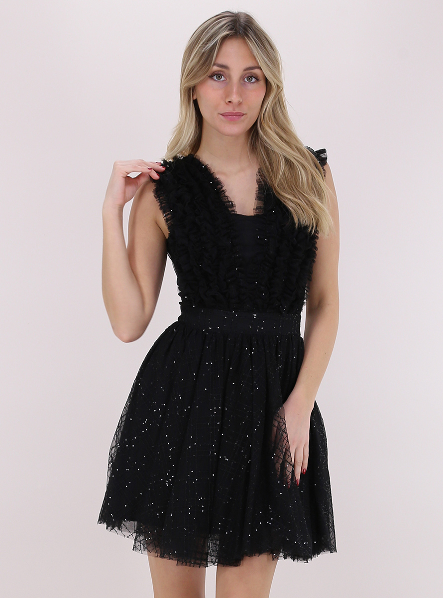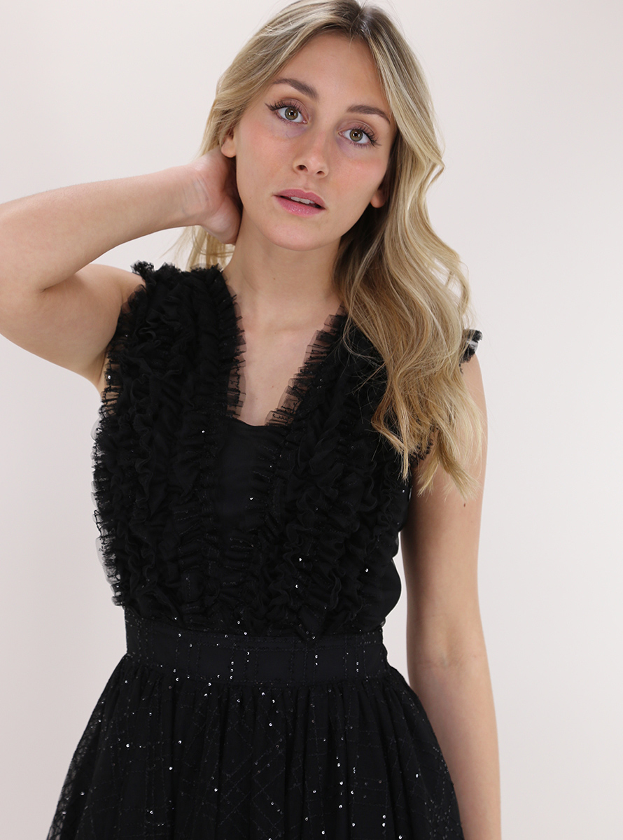 Twin Set Actitude Kleid aus Tüll und Pailletten gefüttert mit V-Ausschnitt und Rouge auf der Vorderseite. Radboden und seitlicher Reißverschluss. Das Model ist 1,75 groß und trägt Größe XS.