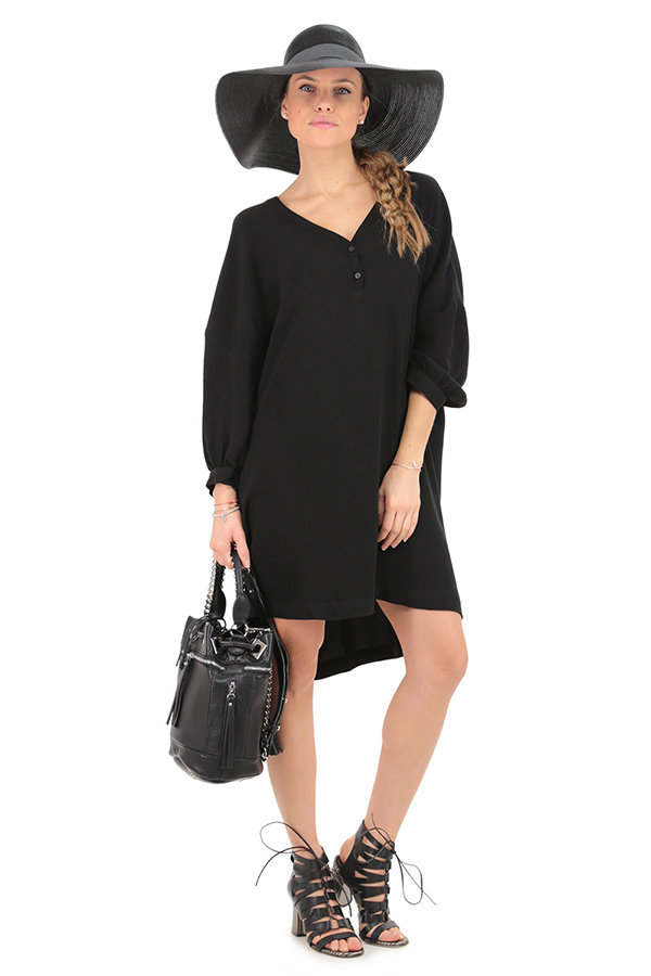 Abito a trapezio, scollo a V e maniche a 3\4 con fondo arricciato. La modella è alta 1,68 ed indossa la taglia unica.