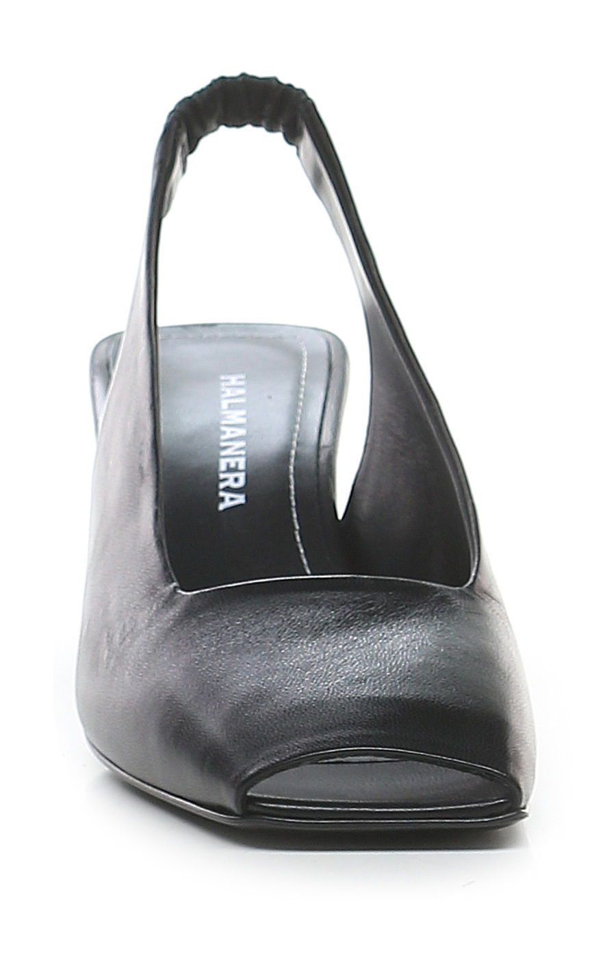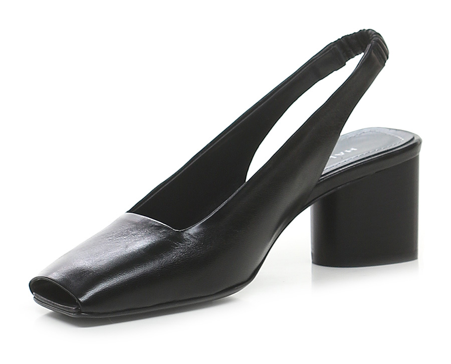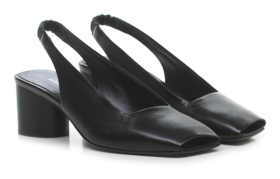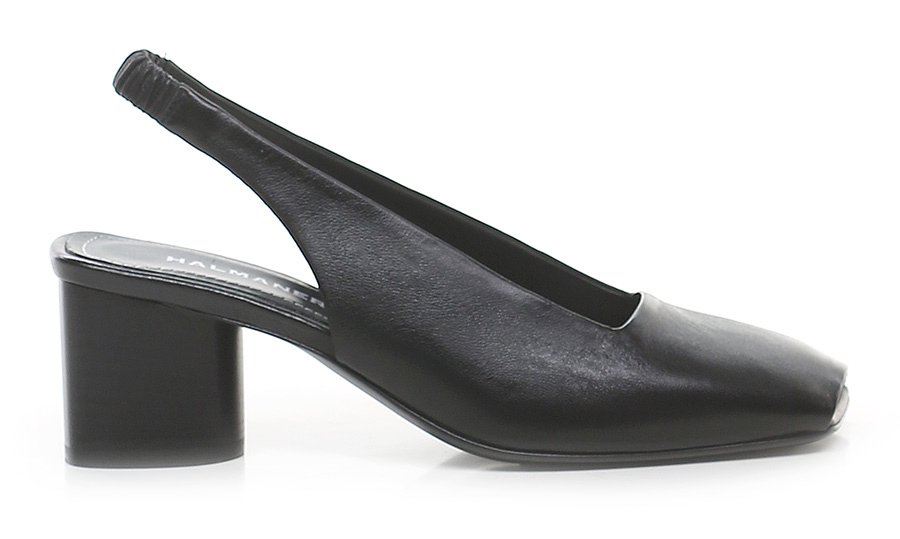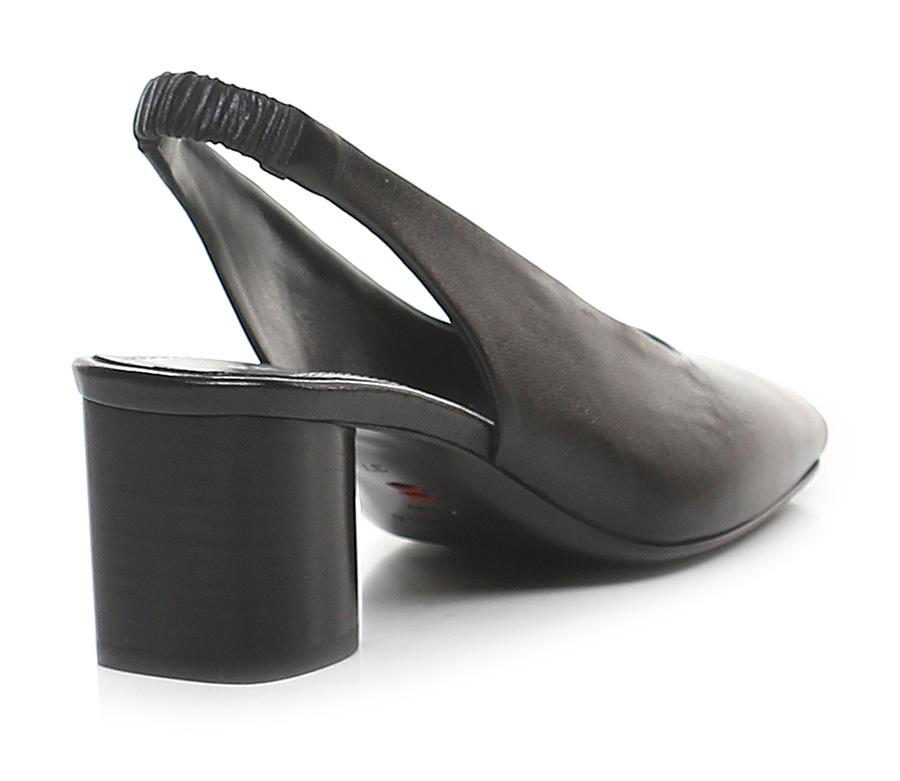 Lederschuh mit elastischem Rückenriemen. Ledersohle. Absatzhöhe 65mm. Absatz in Holzoptik.