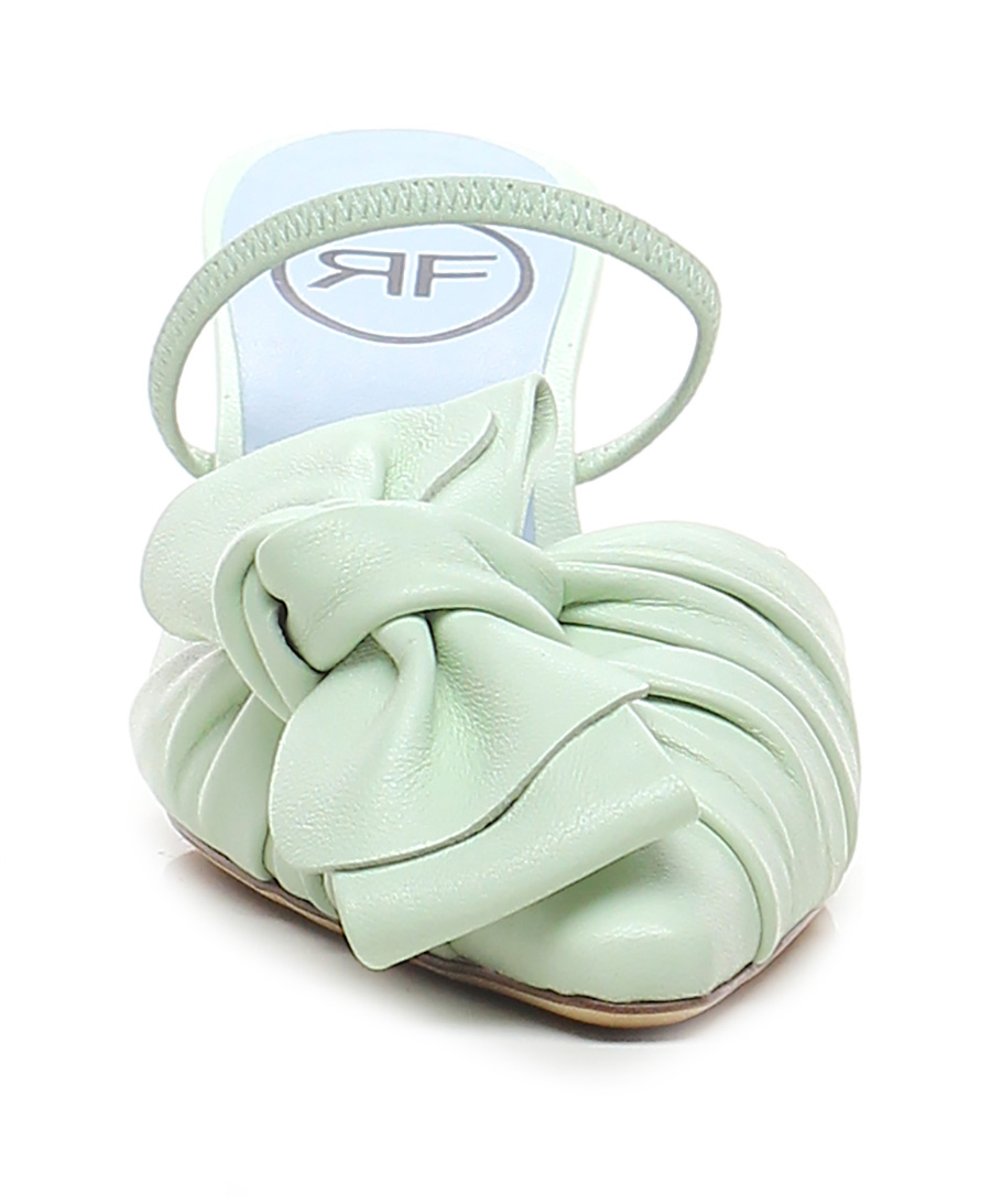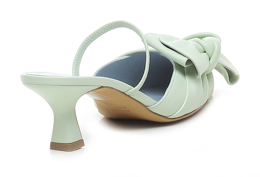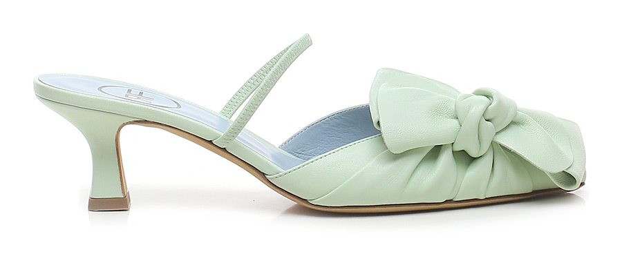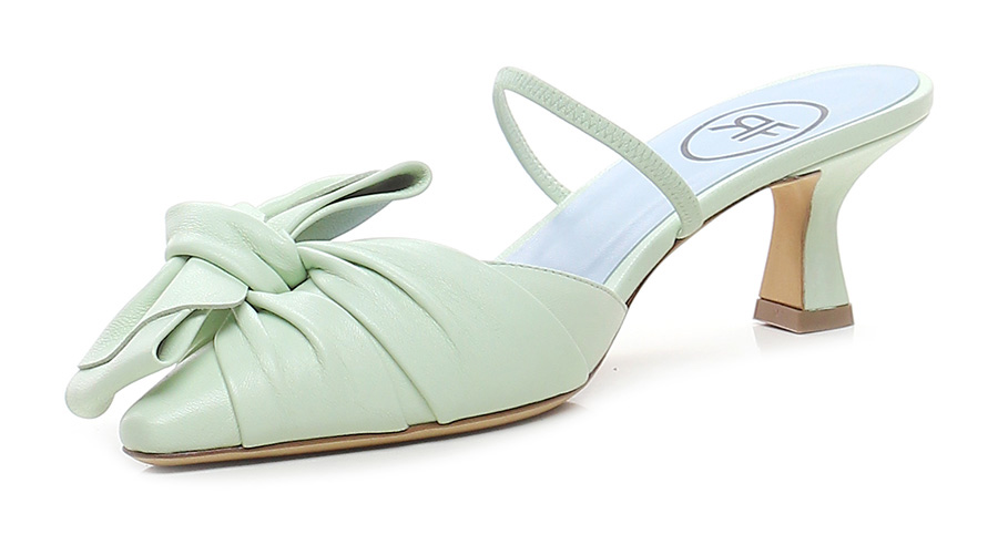 Schuh mit Lederabsatz, Maxi-Schleife an der Spitze und Riemchen am Spann mit elastischem Einsatz, Ledersohle. Absatz 60, ausgestellt.