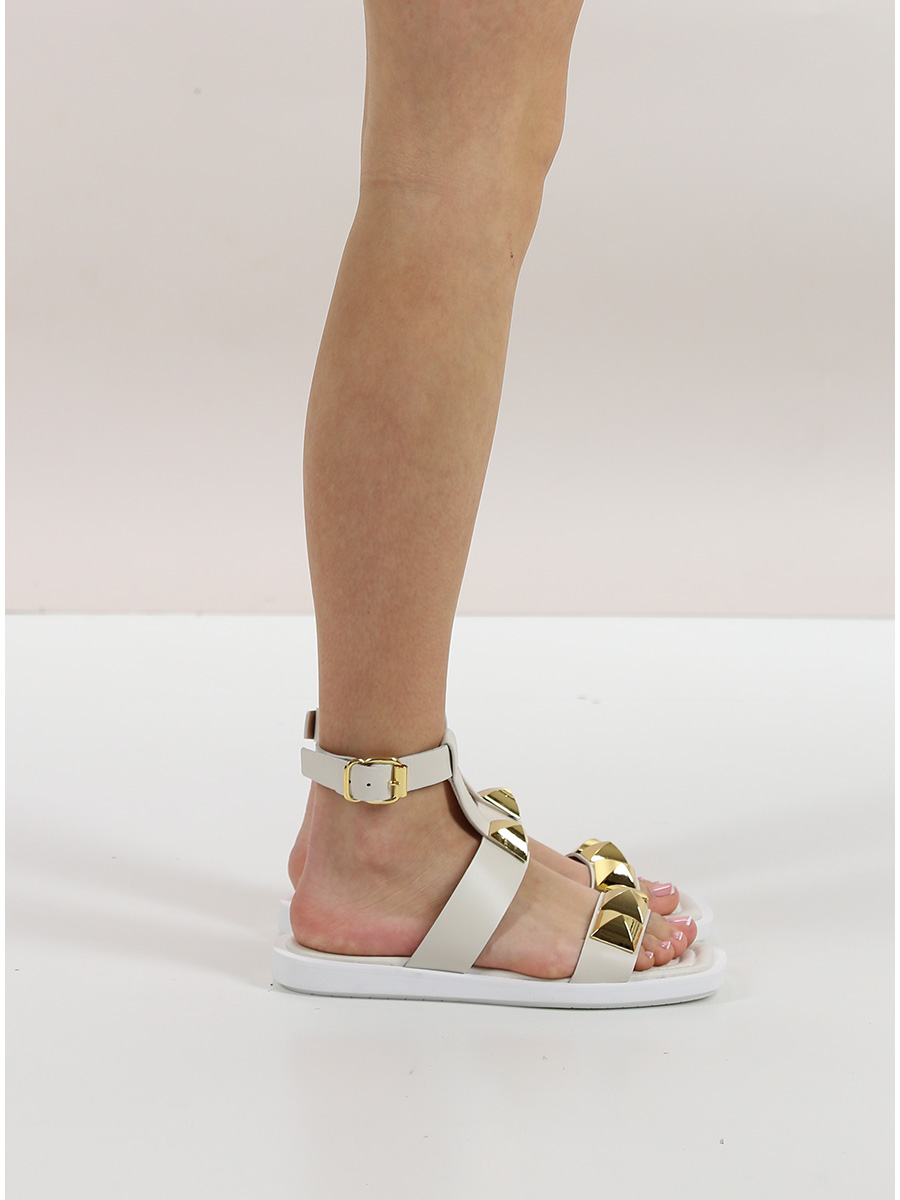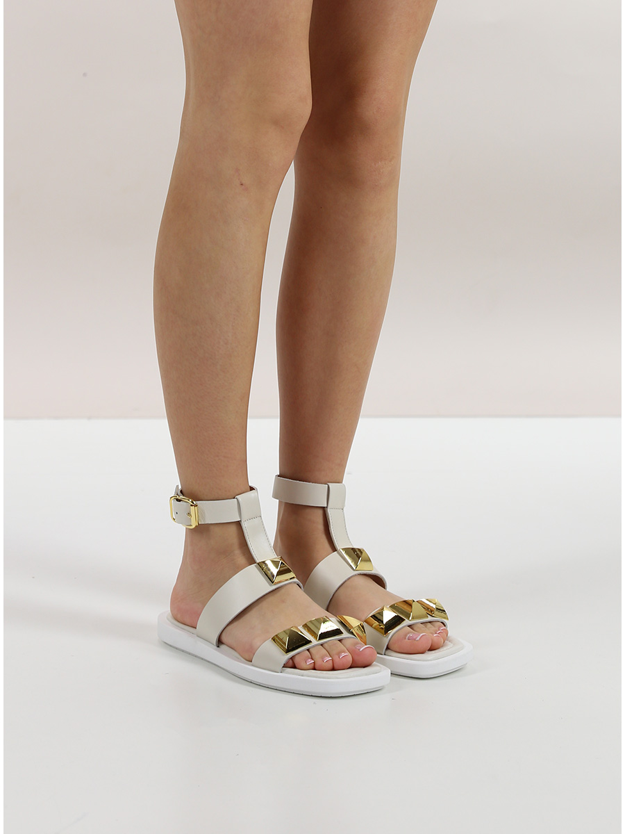 Ledersandale mit goldenen Nieten am Obermaterial. Gummisohle. 20 mm Absatzhöhe, 15 mm Plateau mit 5 mm Absatz.