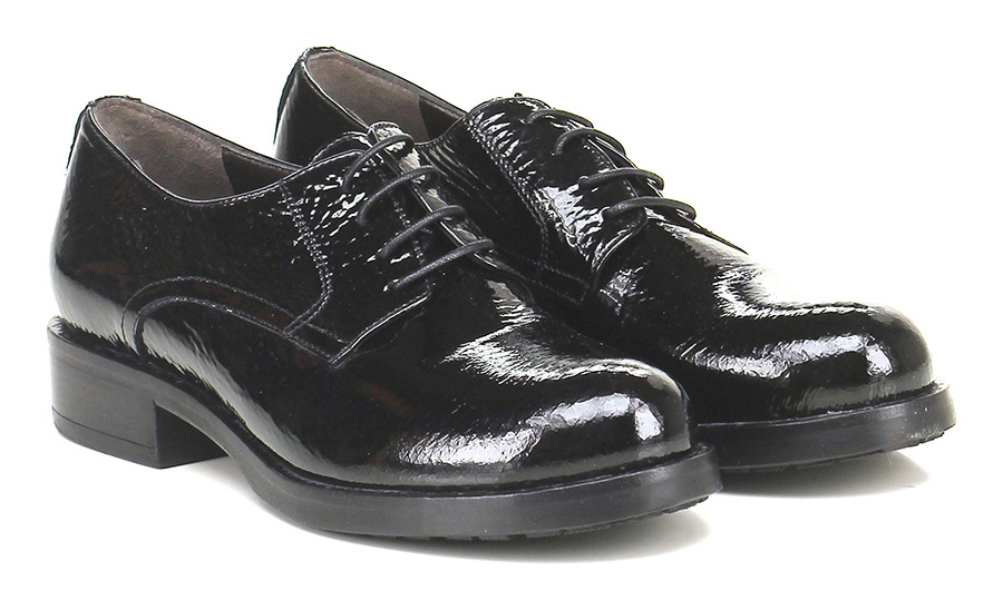 Scarpa bassa in vernice effetto crack vintage con borchie su profilo suola e suola in cuoio e gomma. Tacco 30.