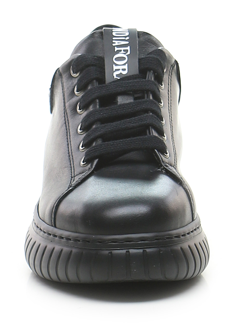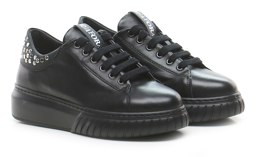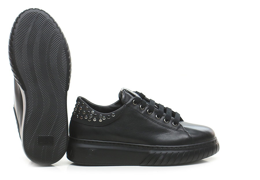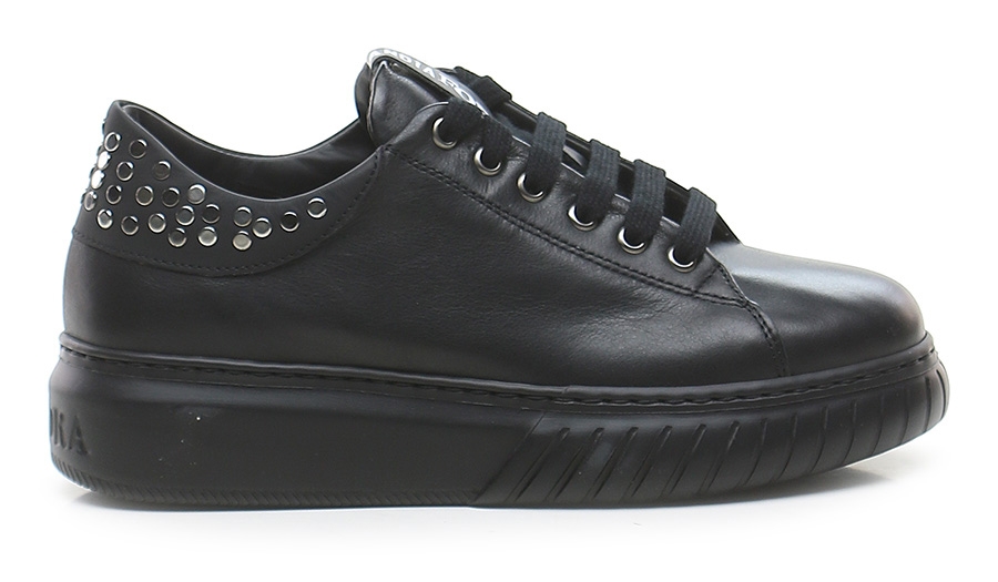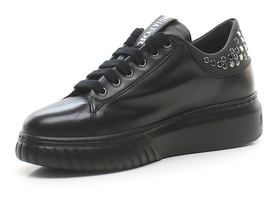 Ledersneaker mit Nieten auf der Rückseite. Gummisohle, 40 mm Absatzhöhe, 30 mm Plateau mit 10 mm Absatz.