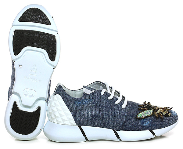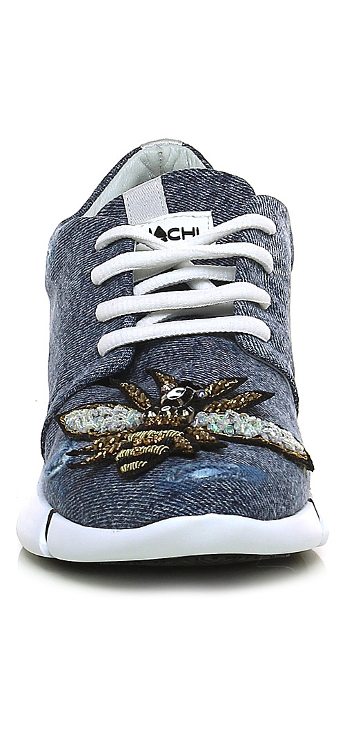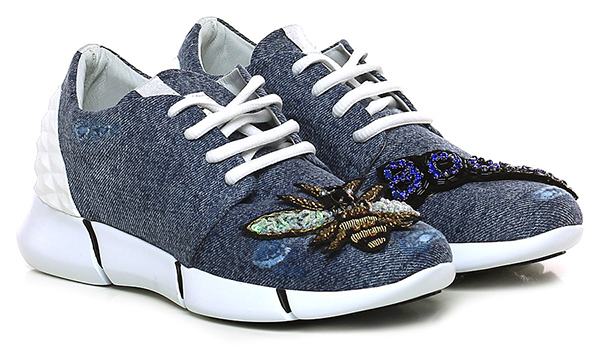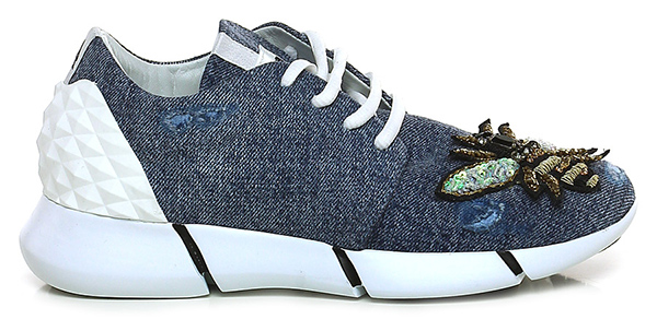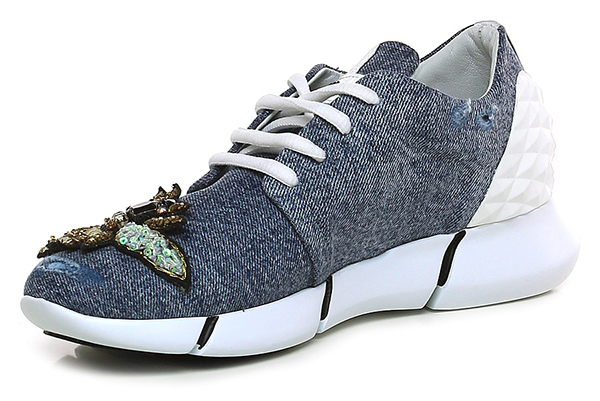 Stoffsneaker mit PVC-Einsätzen in Nietenoptik auf der Rückseite und Stoffapplikationen mit Trass vorne. Extra leichte Gummisohle, 40er Absatz, 20er Plateau mit 20er Absatz.