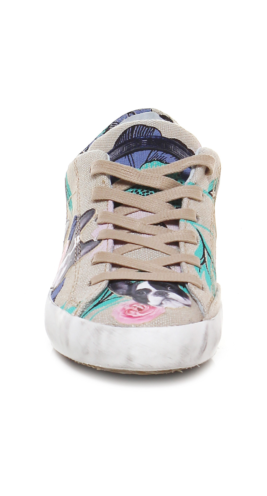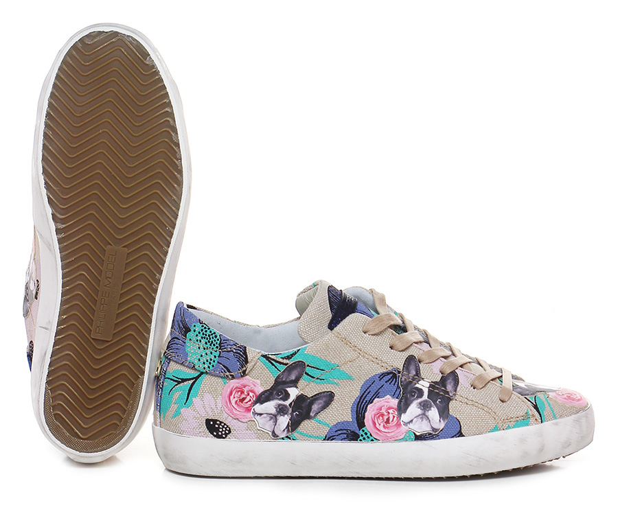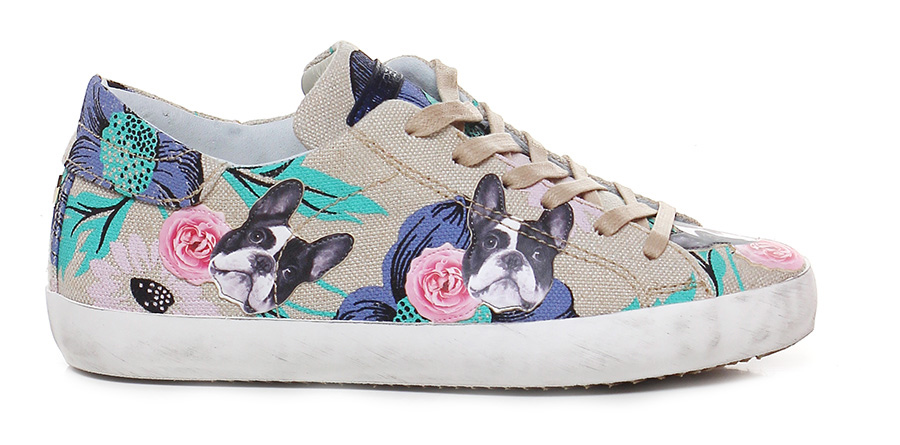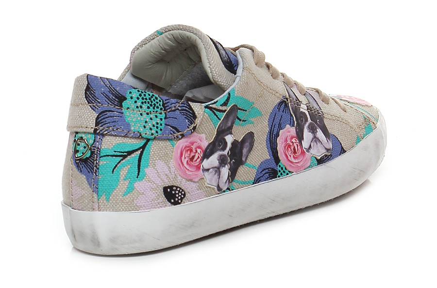 Sneaker aus Stoff mit Vintage-Gummisohle. Blumendrucke und Patches. Absatz 25, Plateau 25. Innenkeil 25.