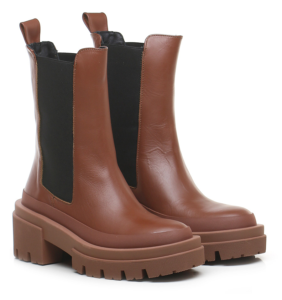 Stiefelette aus Leder mit seitlichen elastischen Einsätzen im Chelsea-Stil. Stollensohle aus Gummi. 65 mm Absatzhöhe, 35 mm Plateau mit 30 mm Absatz.