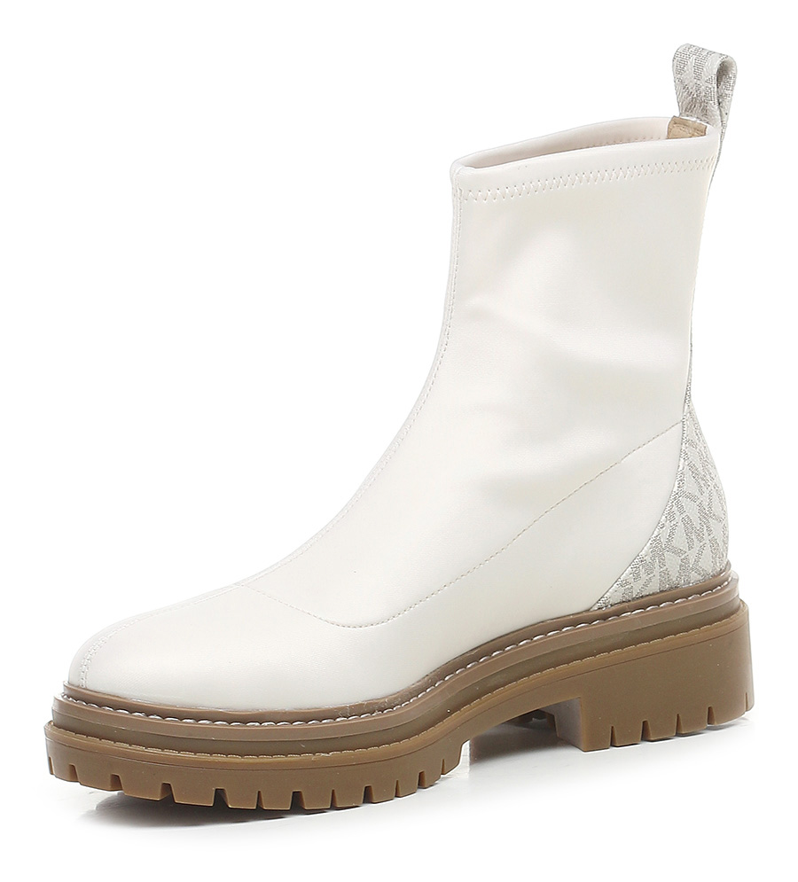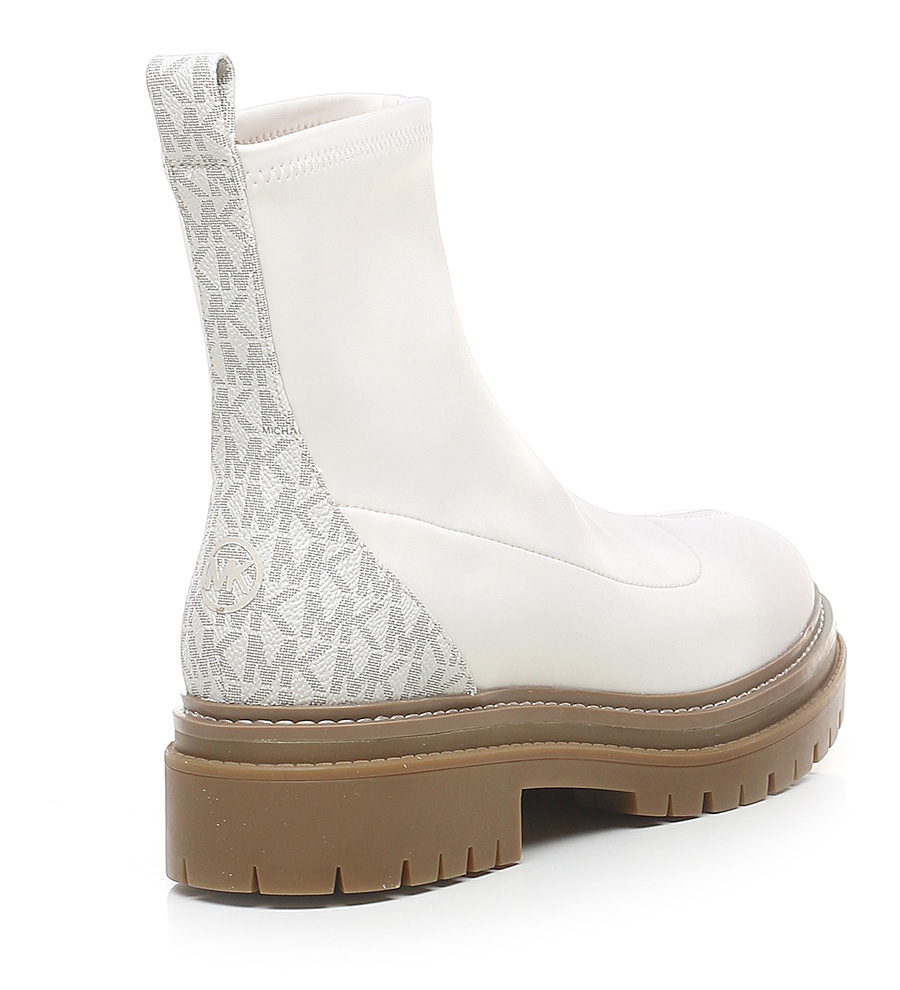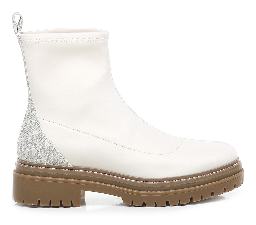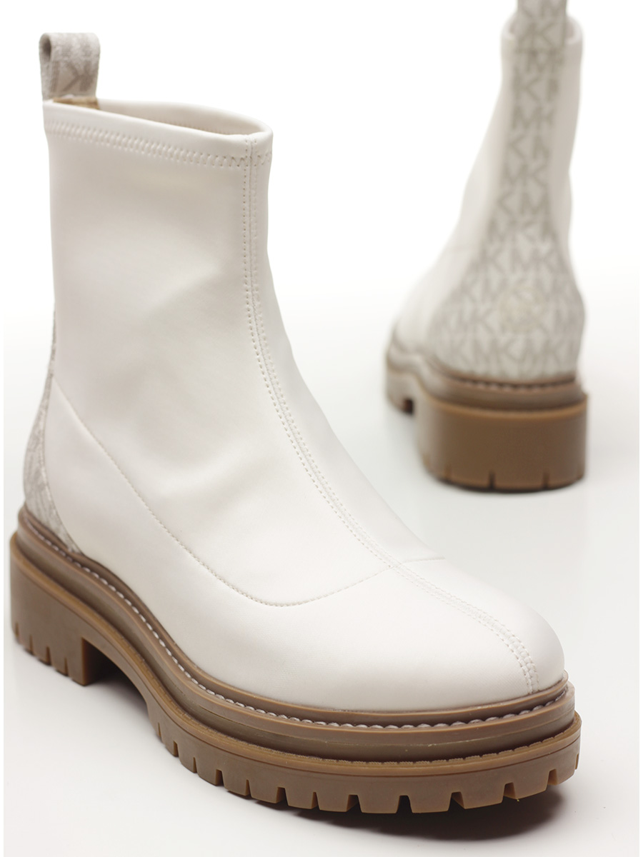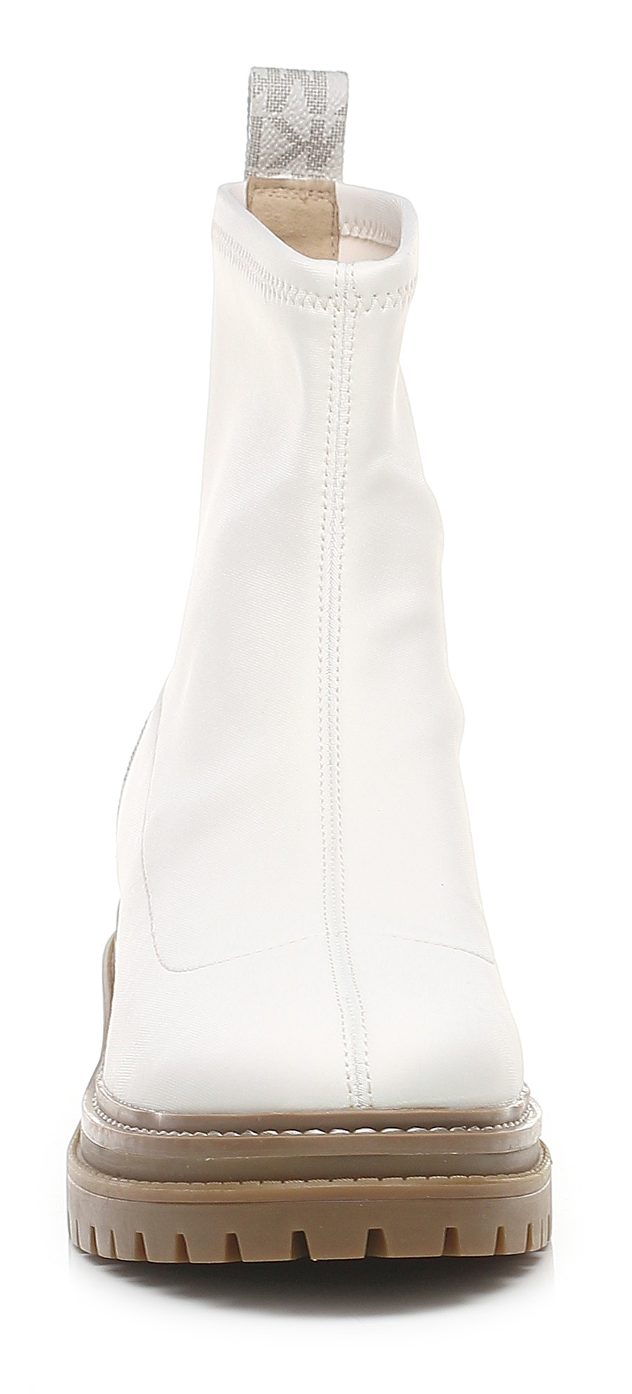Stiefelette aus elastischem Stoff mit Logo-Einsatz aus Kunstleder und Gummisohle. 45 mm Absatzhöhe, 30 mm Plateau mit 15 mm Absatz.