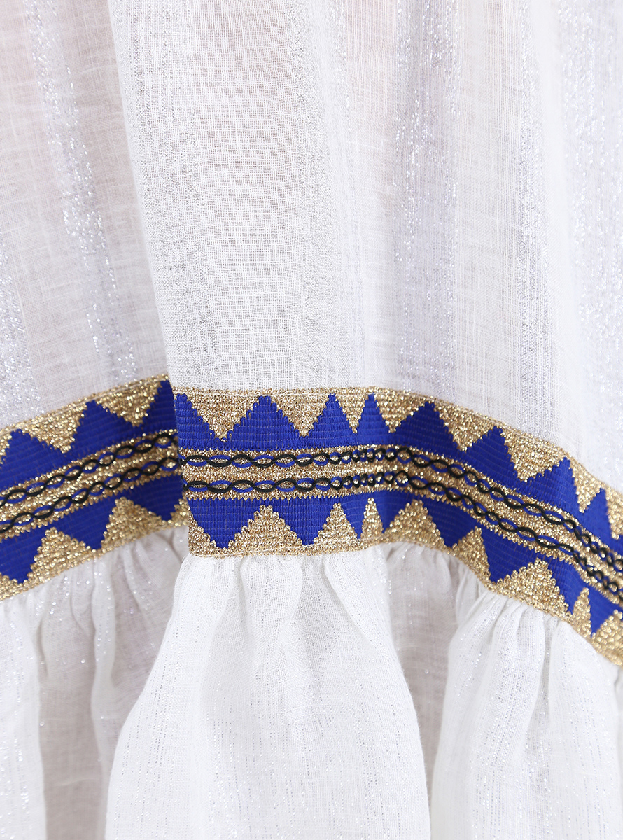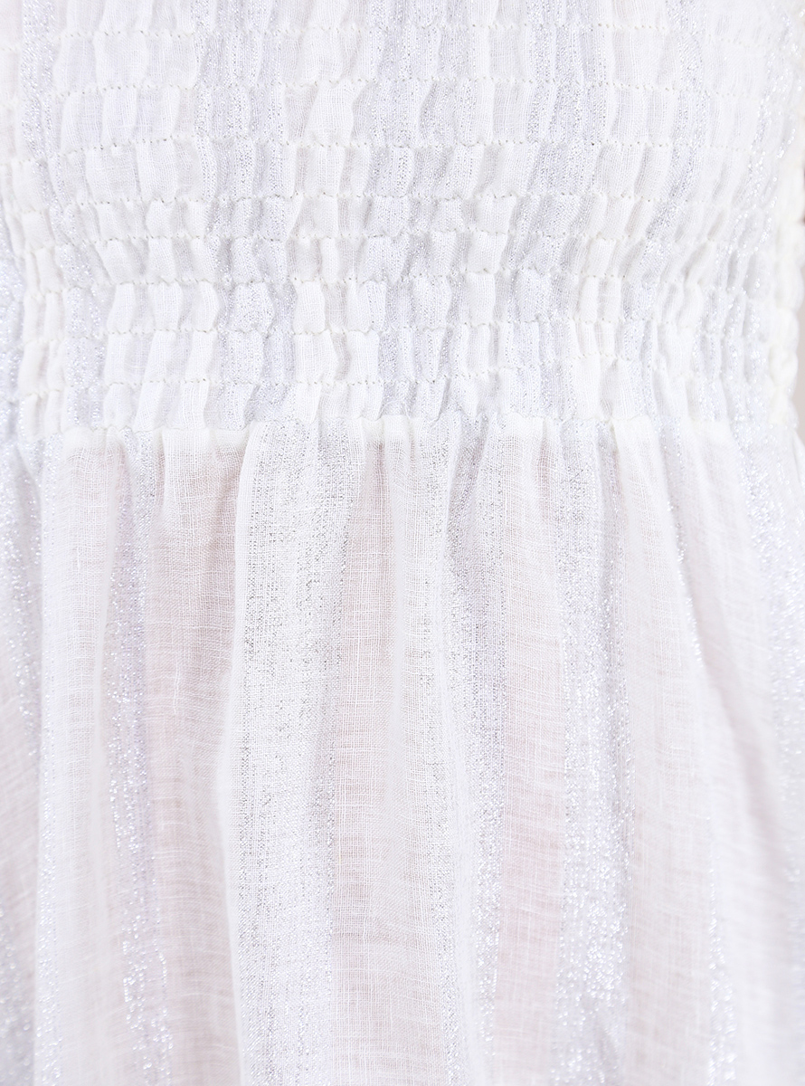Pho Firenze Kleid aus einer Mischung aus Leinen und Viskose mit elastischem Oberteil. Asymmetrischer Boden mit gerafften Rüschen. Aufgesetztes Band in Kontrast mit Lurex. Streifenmuster Ton in Ton. Das Model ist 1,70 groß und trägt Größe S.