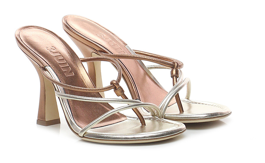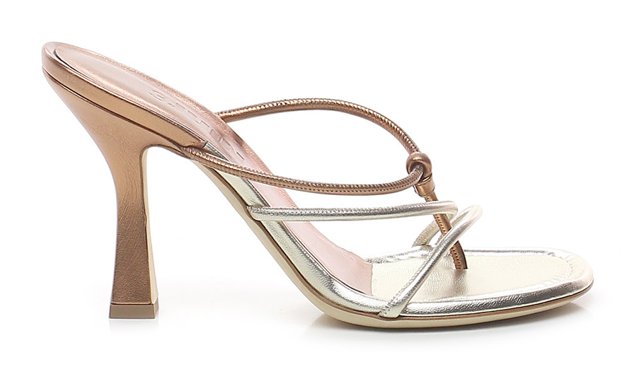 Hohe Zehenstegsandale aus laminiertem Leder, Ledersohle. 105 Absatz.
