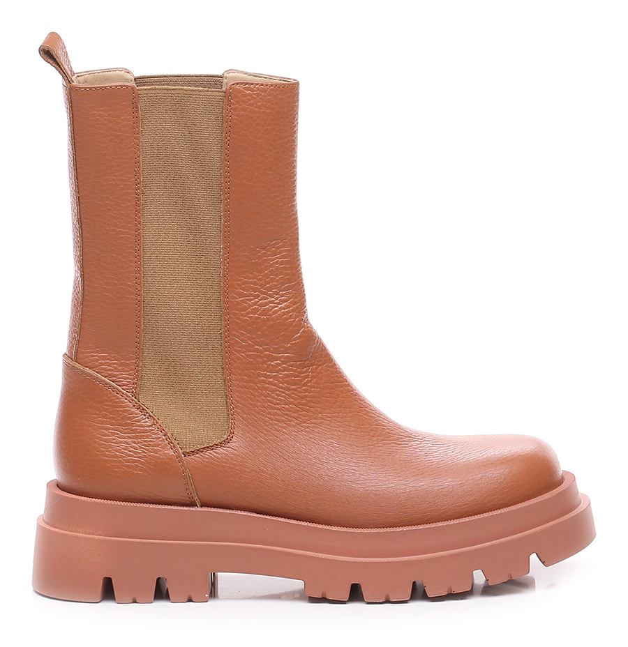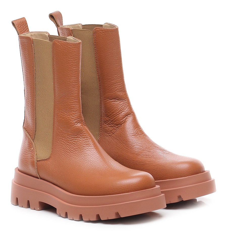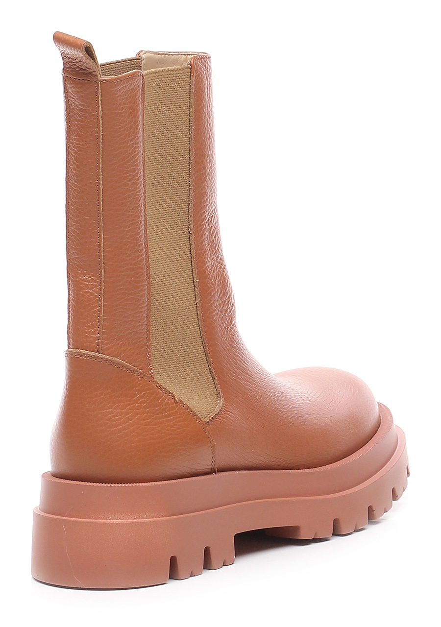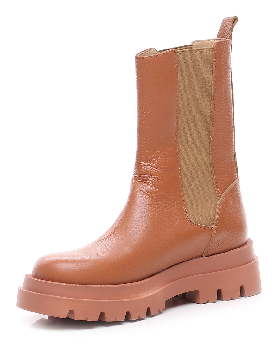 Klobige Stiefelette aus strukturiertem Leder mit elastischen Einsätzen auf beiden Seiten, Gummisohle. Absatz 55, Plateau 35 mit Absatz 20, runde Spitze.