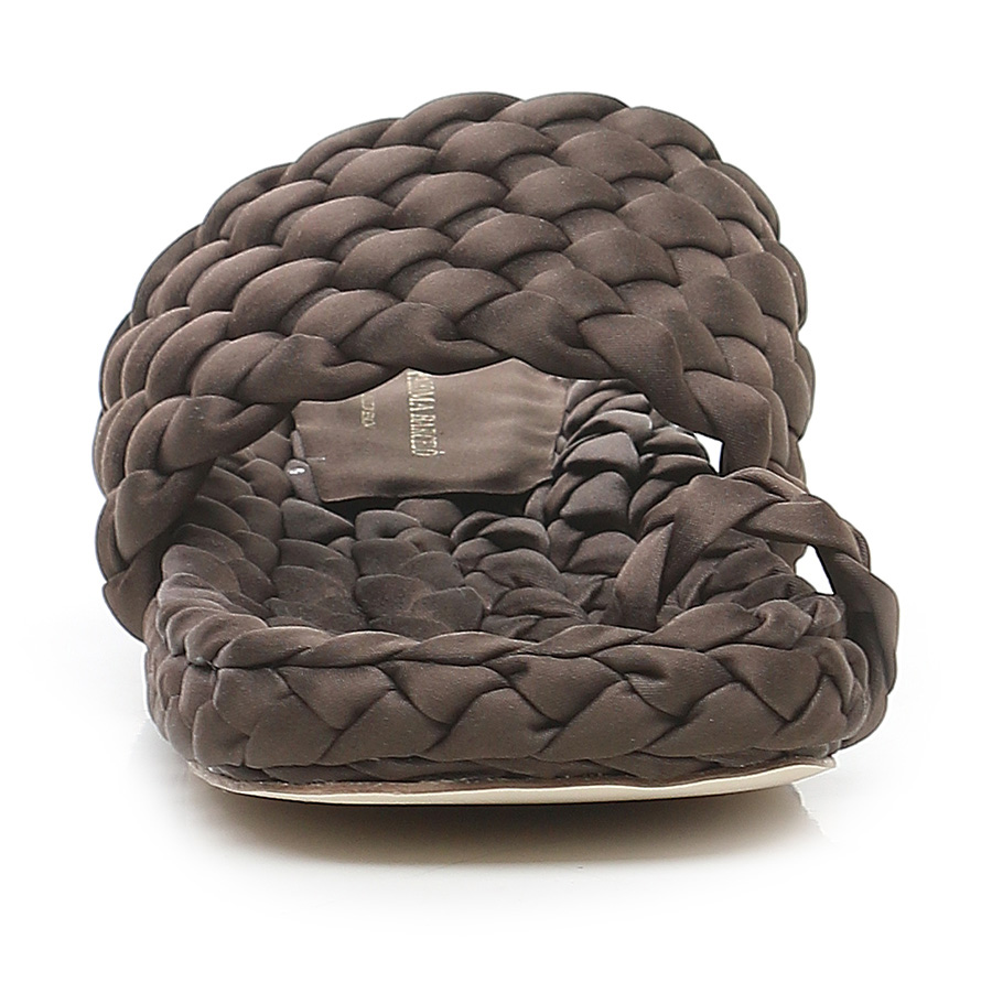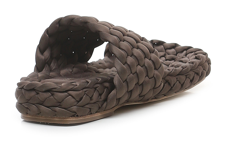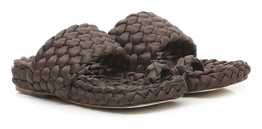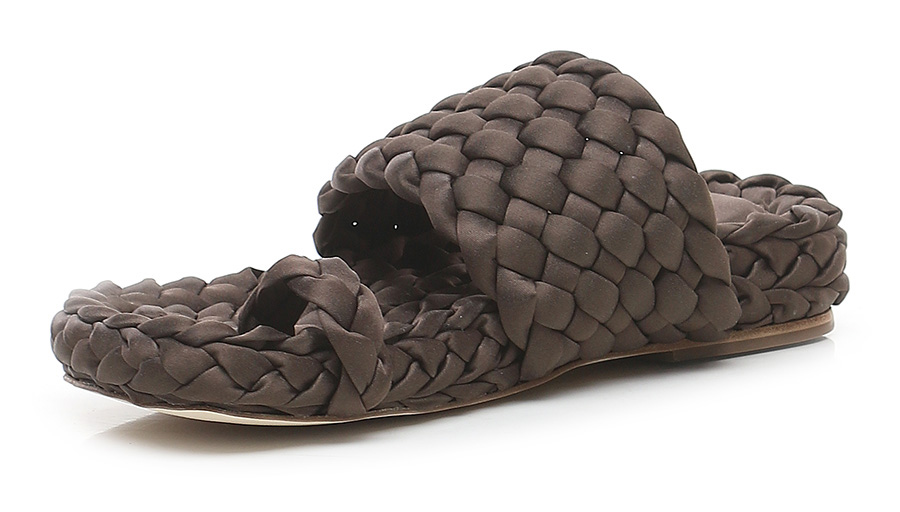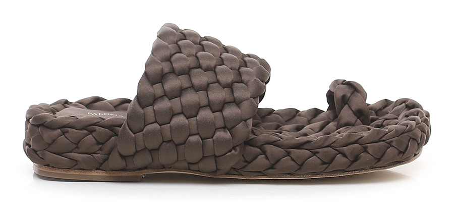 Satinsandale mit gewebtem Obermaterial und Plateau. Ledersohle. Absatzhöhe 35 mm, Plateau 25 mm mit 10 mm Absatz.