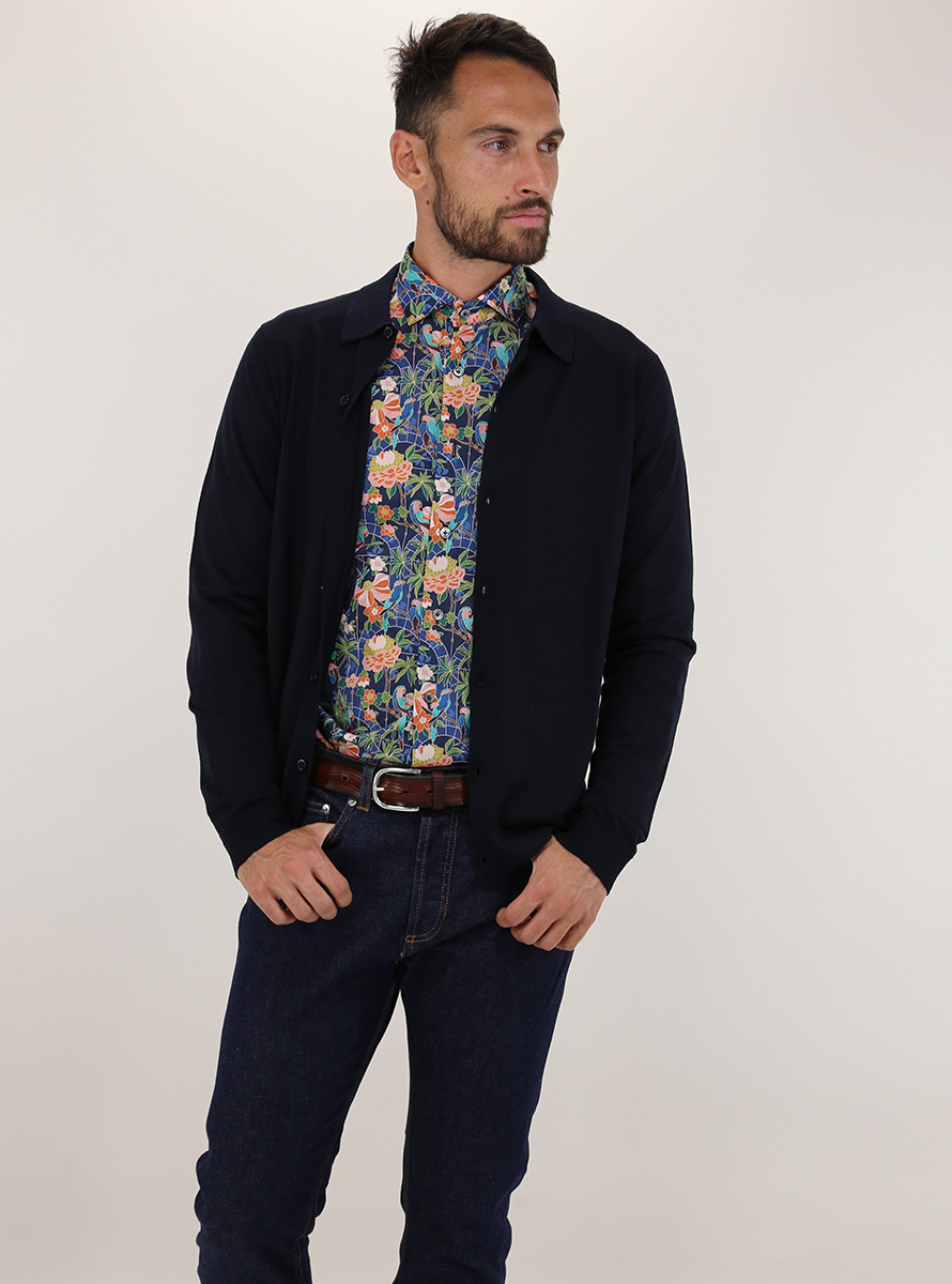 Jeordie's Hemdblusenpullover aus extrafeiner reiner Merinowolle, die nicht schrumpft. Lange Ärmel mit Manschetten und Verschlussknöpfen vorne. Das Model ist 1,80 groß und trägt Größe M.