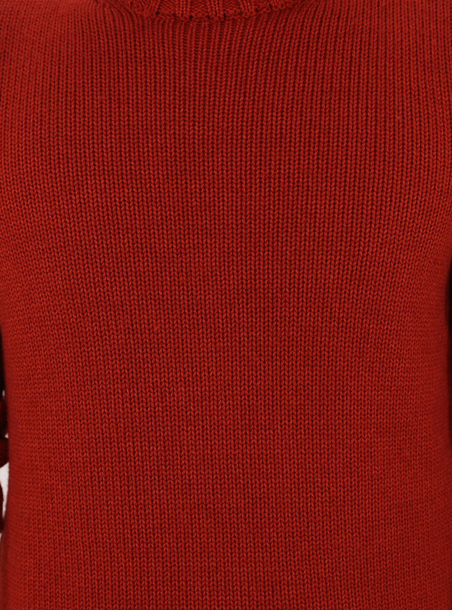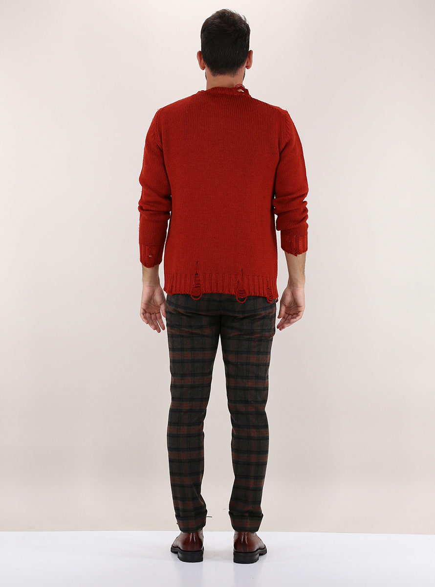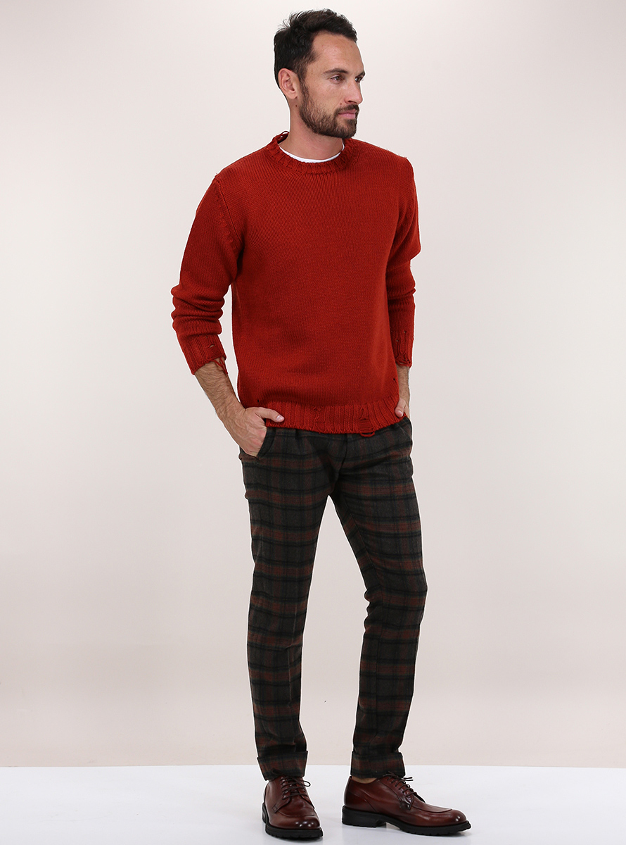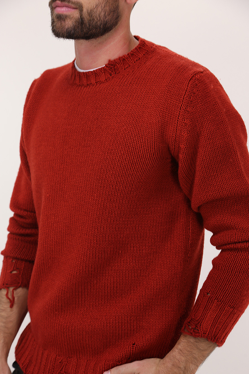 Pt-Pullover aus Wolle mit langen Ärmeln und Rundhalsausschnitt. Manschettenkanten mit Rissen und Abschürfungen. Das Model ist 1,80 groß und trägt Größe 48.