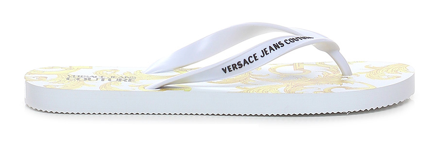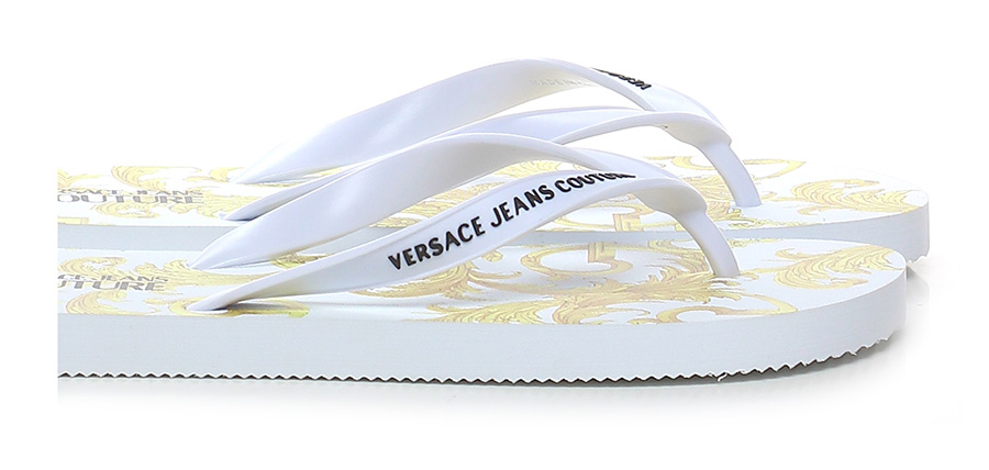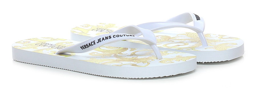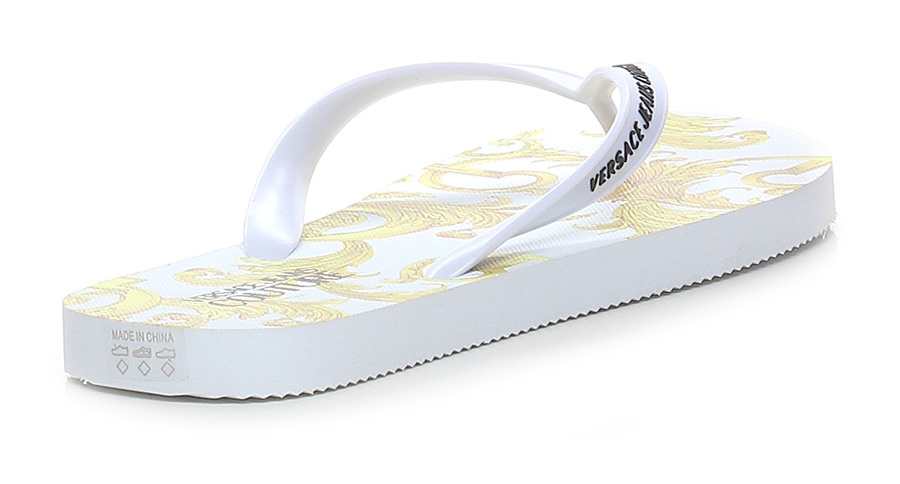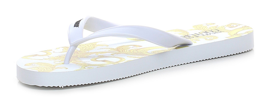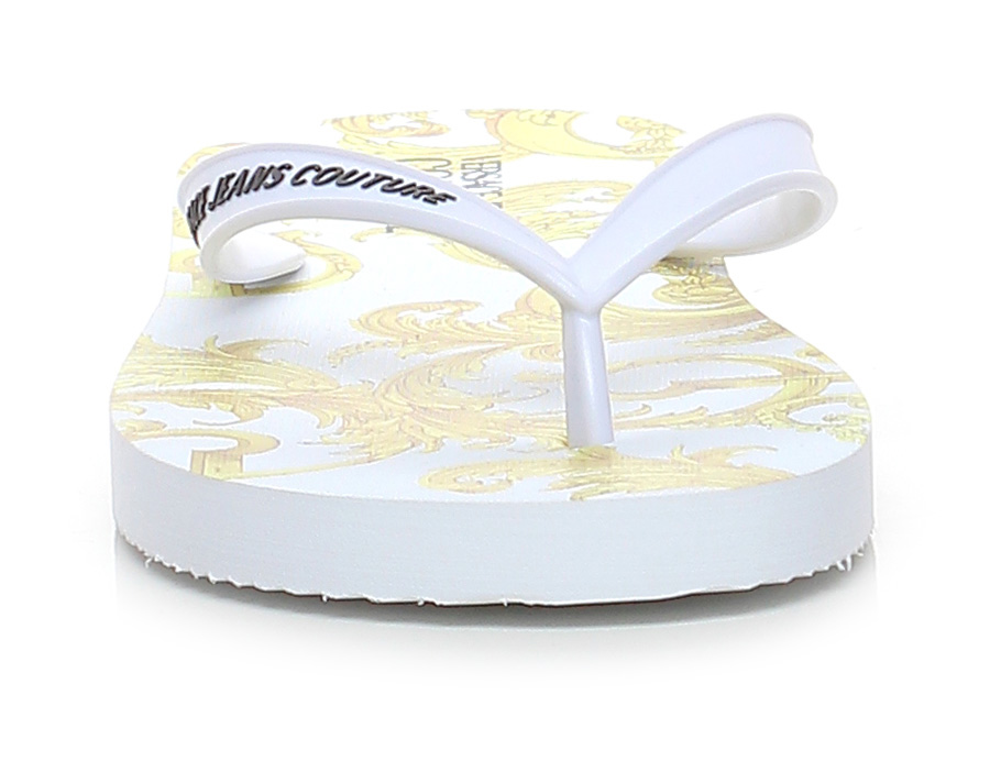 Zehentrenner aus PVC mit Barock-Print von Versace Jeans Couture. Gummisohle Absatz 20, Plateau 15 mit Absatz 5.