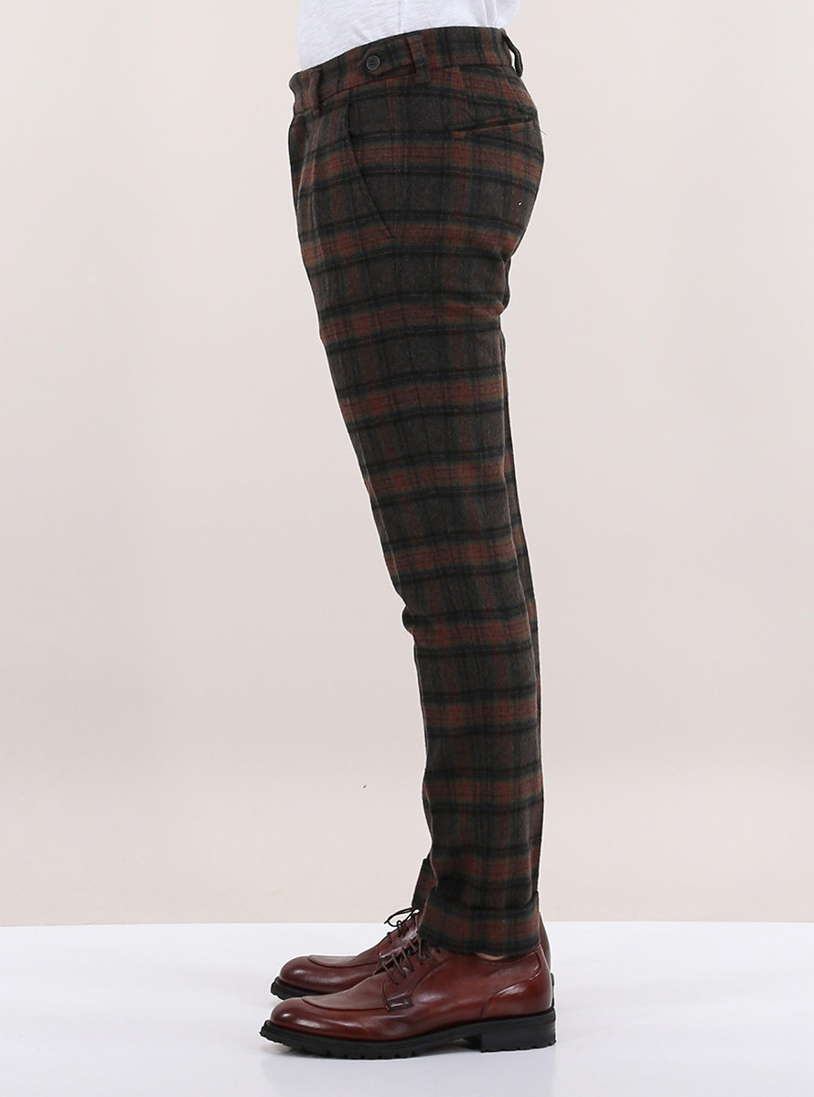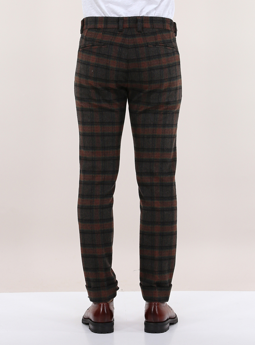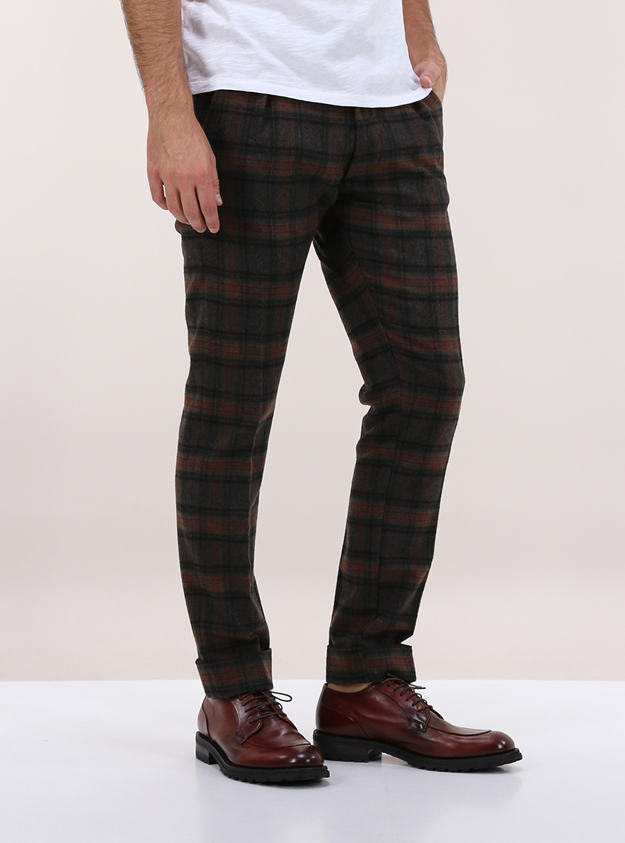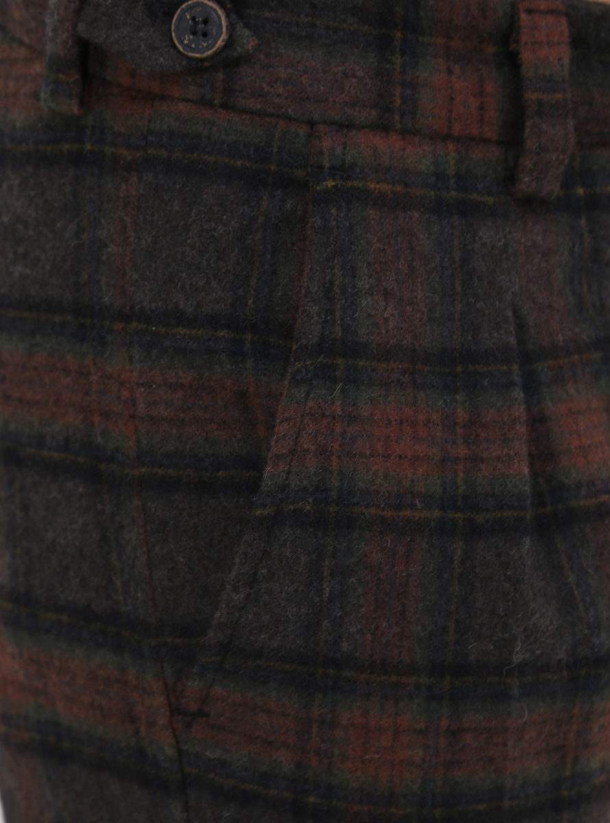 Messaggerie-Hose aus Stretch-Wollmischung, schmale Passform. Frontverschluss mit Haken und Knopf. Seitliche Eingrifftaschen und Paspeltaschen hinten. Umschlag unten. Schottisches Muster. Das Model ist 1,80 groß und trägt Größe 46.