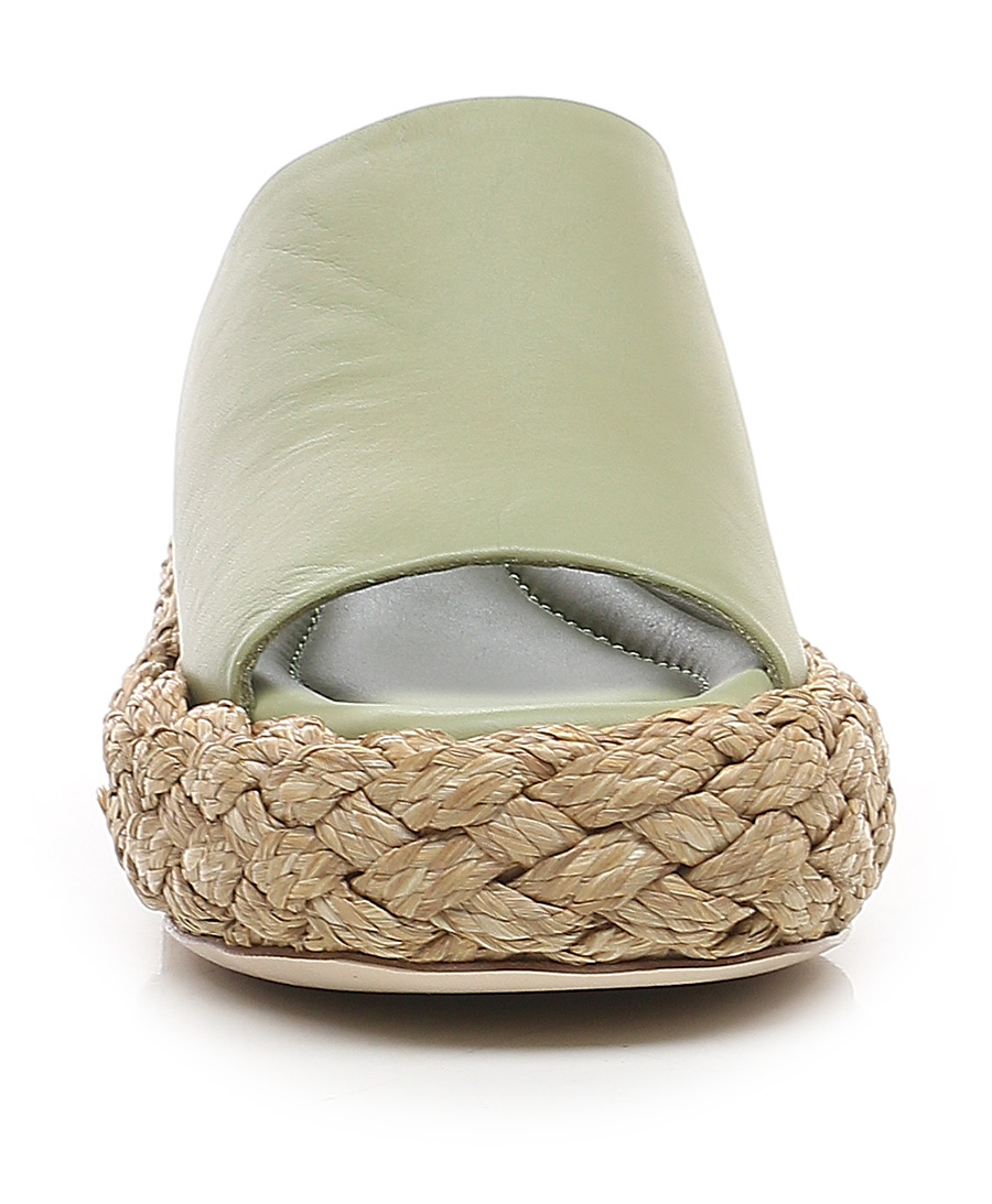Lederkeil mit Ledersohle. Wedge und Plateau mit gewebtem Raffiabast gefüttert. Absatzhöhe 60 mm, Plateau 35 mm mit Absatz 25 mm.