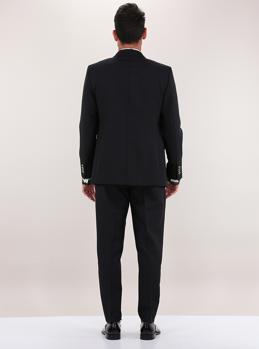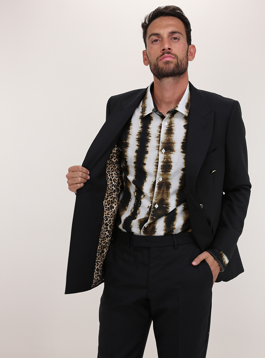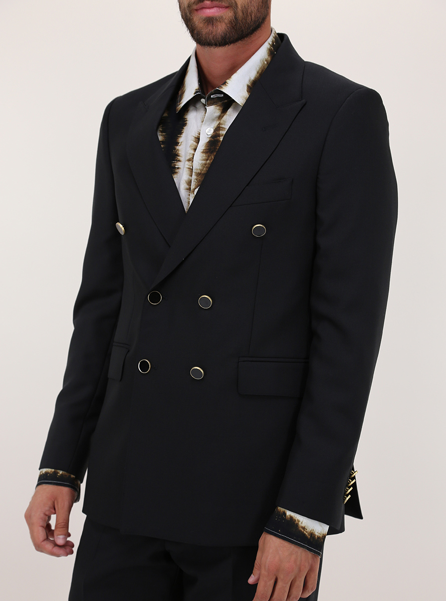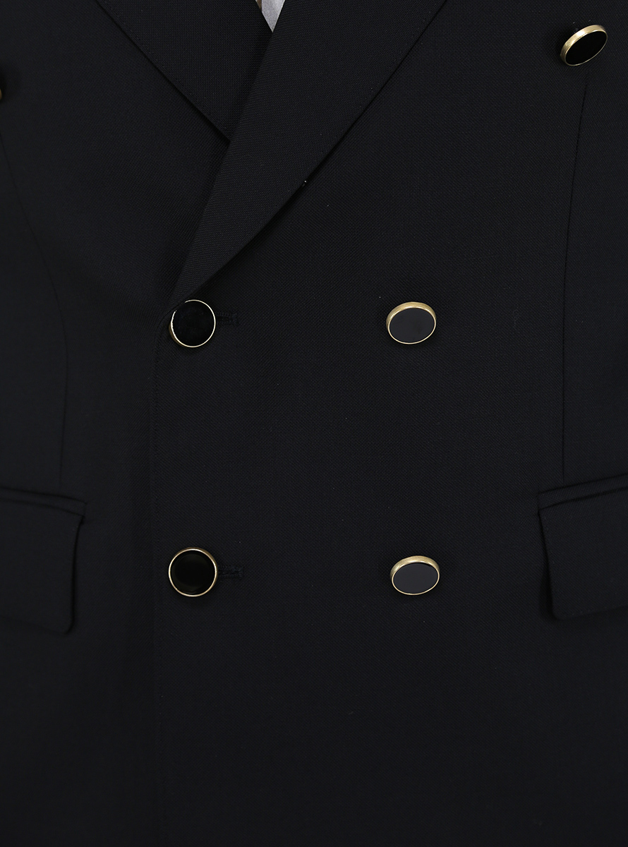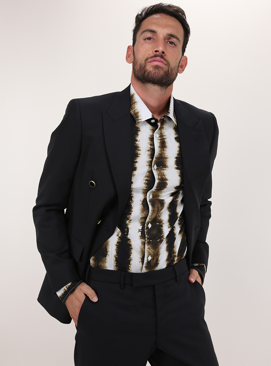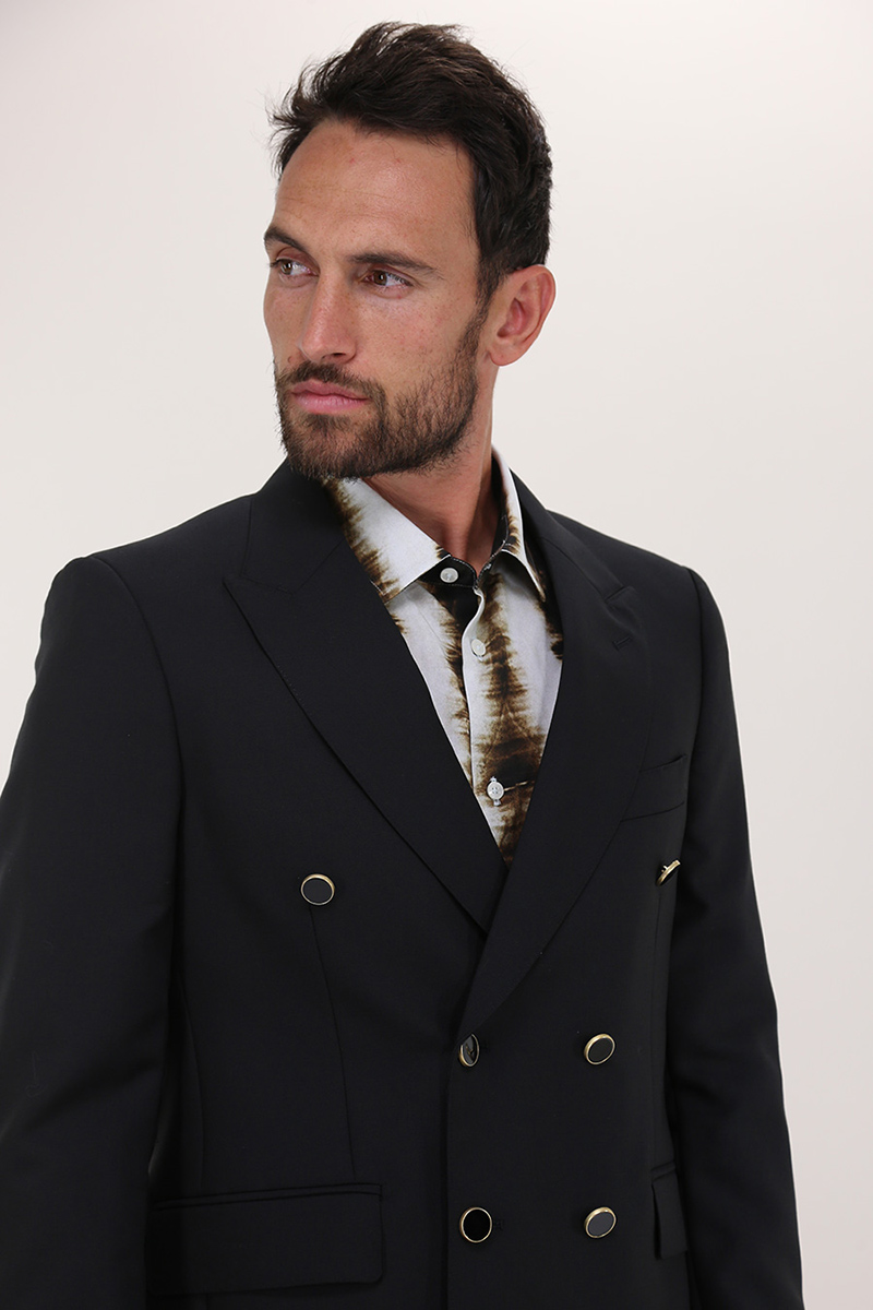 Zweireihige PT-Jacke aus gefütterter Schurwolle und Mohair. Lange Ärmel und Reverskragen. Pattentaschen und fertige Knöpfe. Doppelschlitz auf der Rückseite. Das Model ist 1,80 groß und trägt Größe 48.