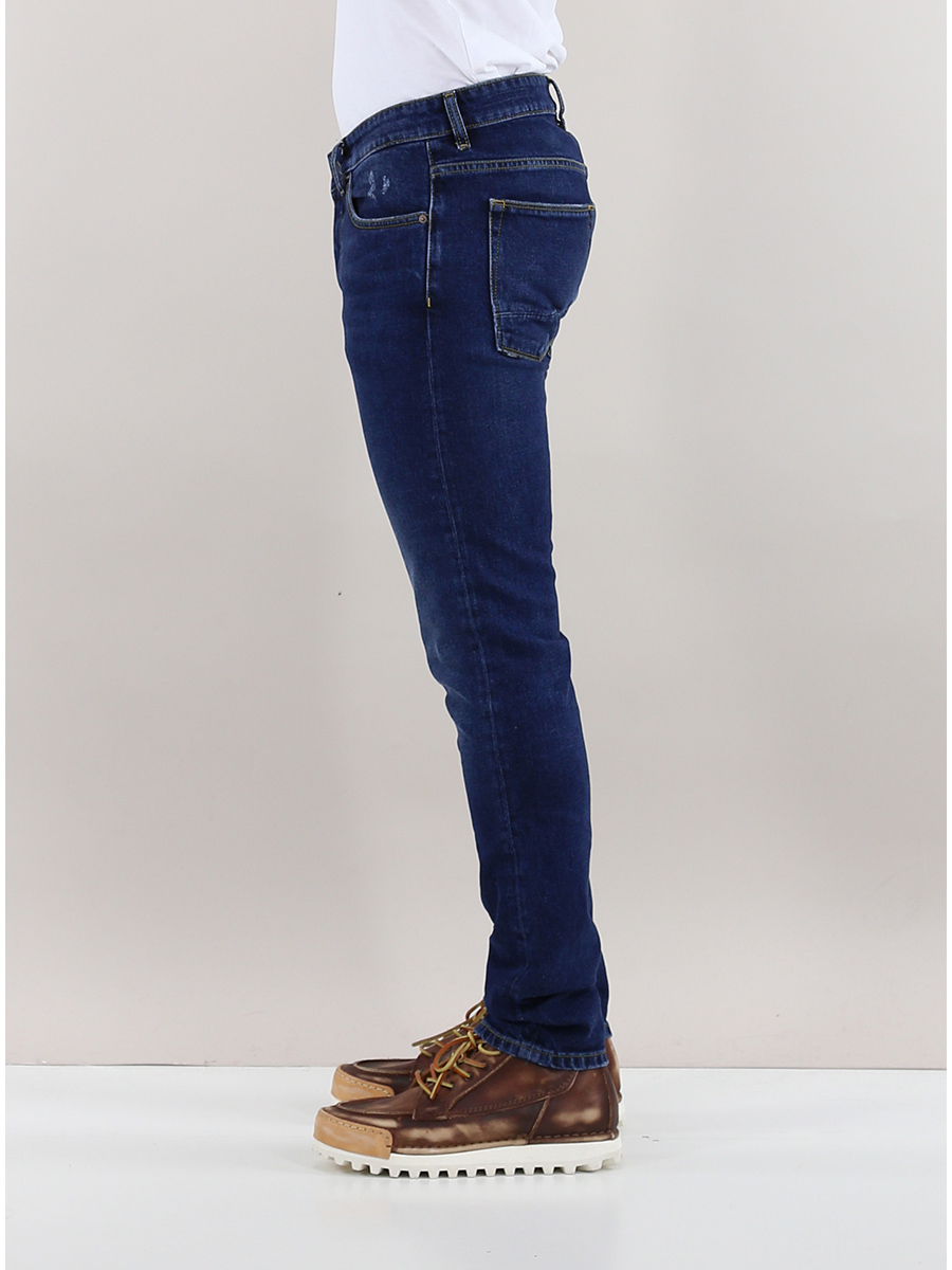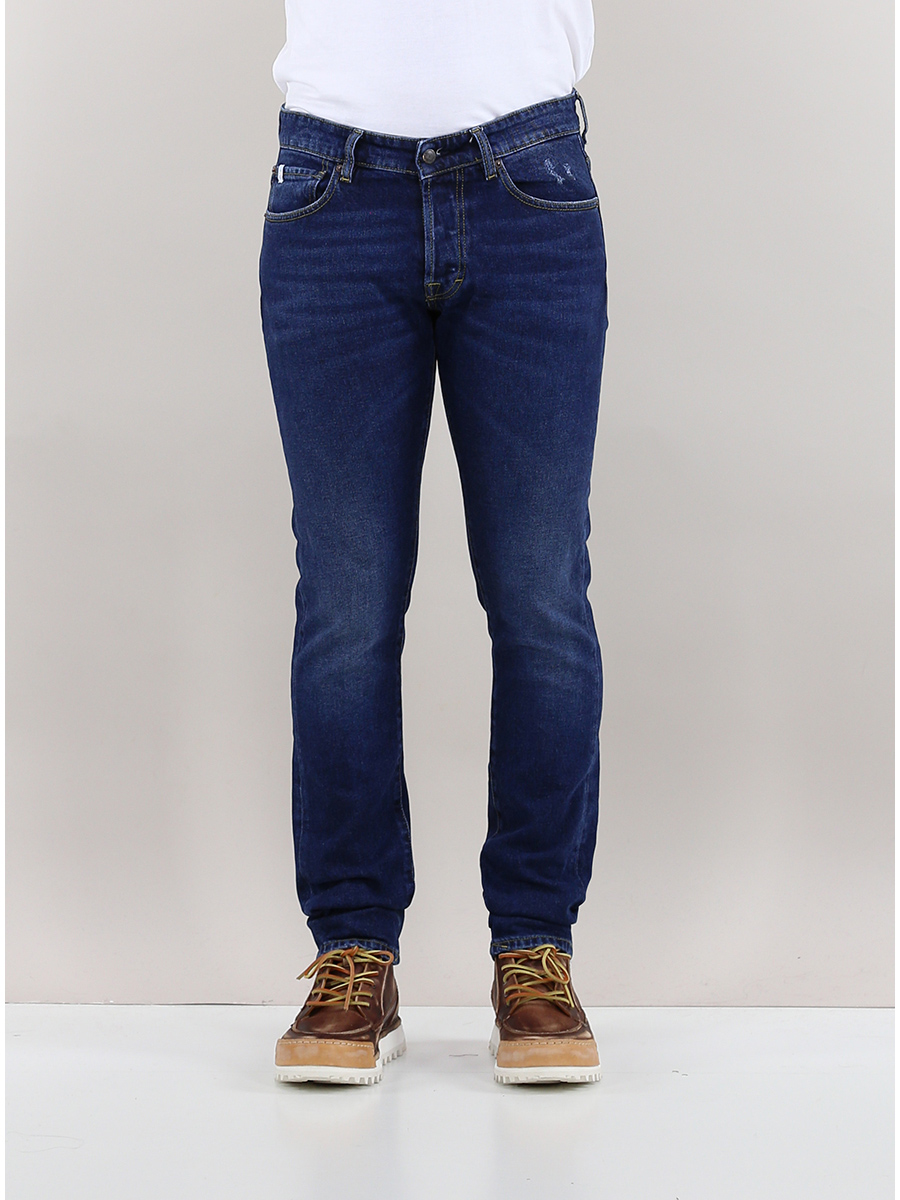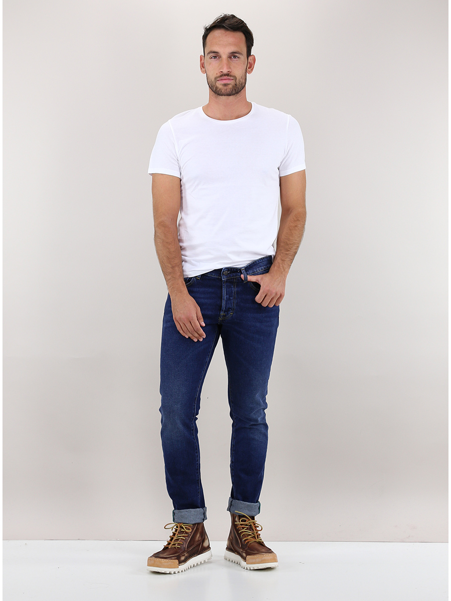 Die Nim-Jeans aus Stretch-Baumwoll-Denim, Slim Fit. Das Model ist 1,80 groß und trägt Größe 31.