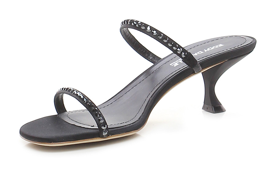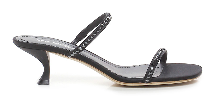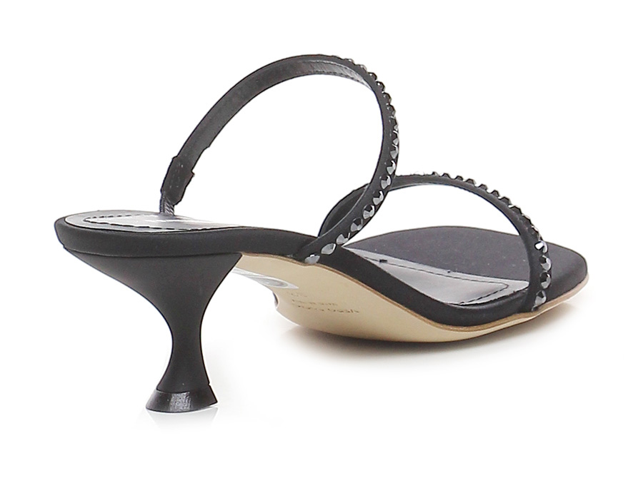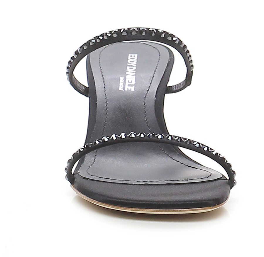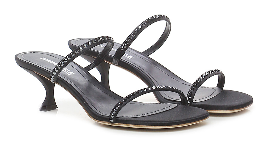 Hohe Sandalette aus Satin mit elastischem Einsatz mit Swarovski-Steinen, Ledersohle. Absatz 60, geschnitzt ausgestellt.