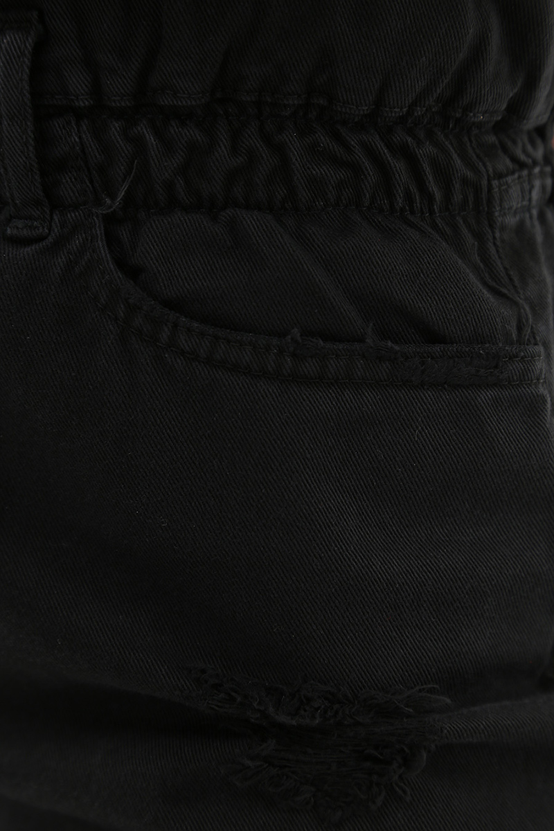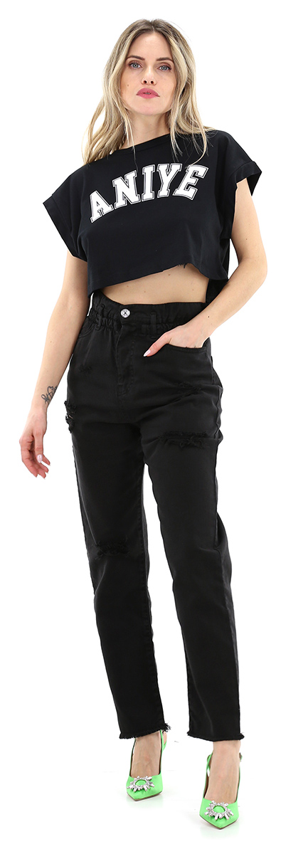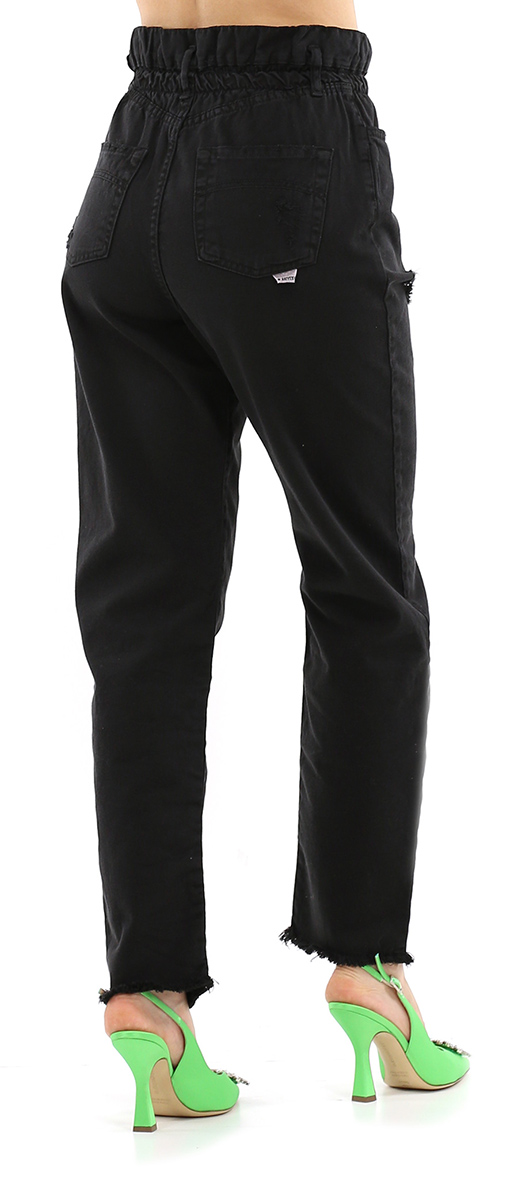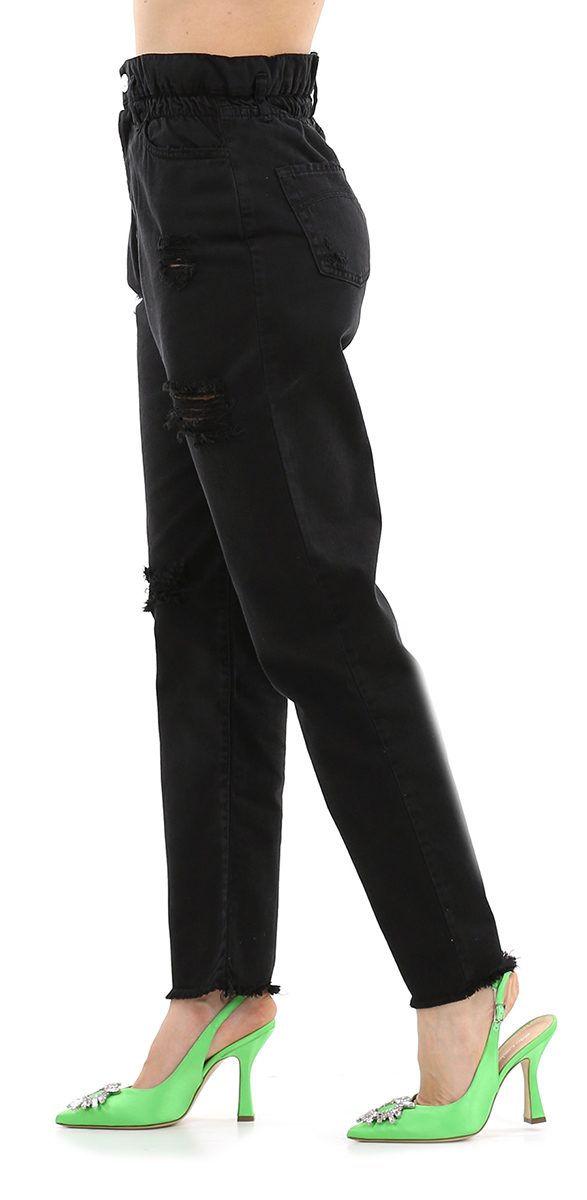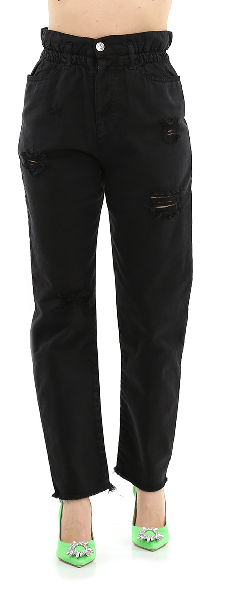 Candy-Jeans aus Baumwolldenim mit Rissen vorne. Das Model ist 1,68 groß und trägt Größe 25.