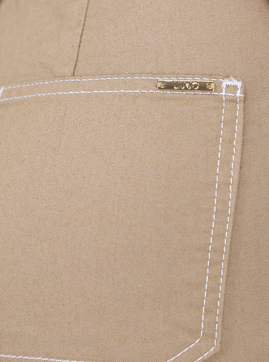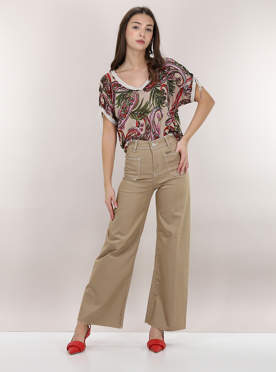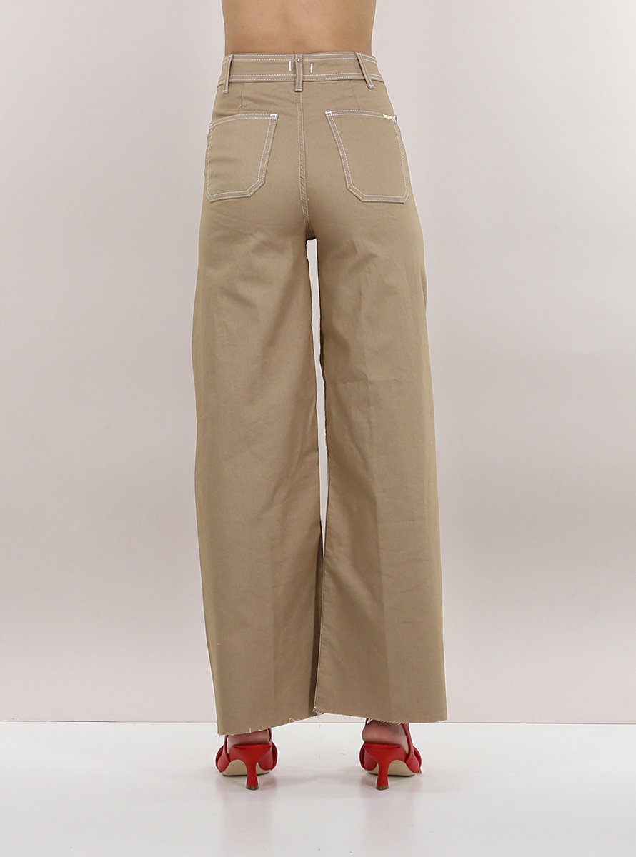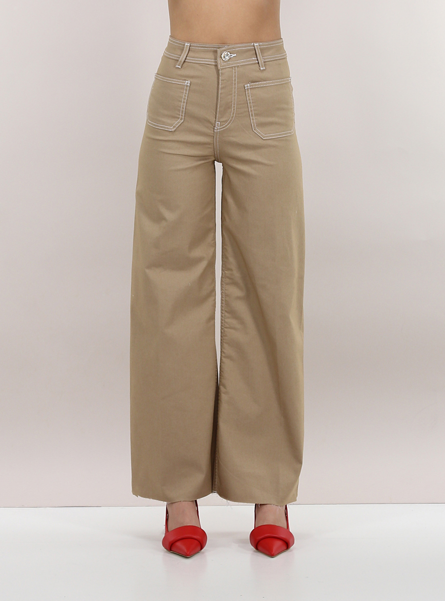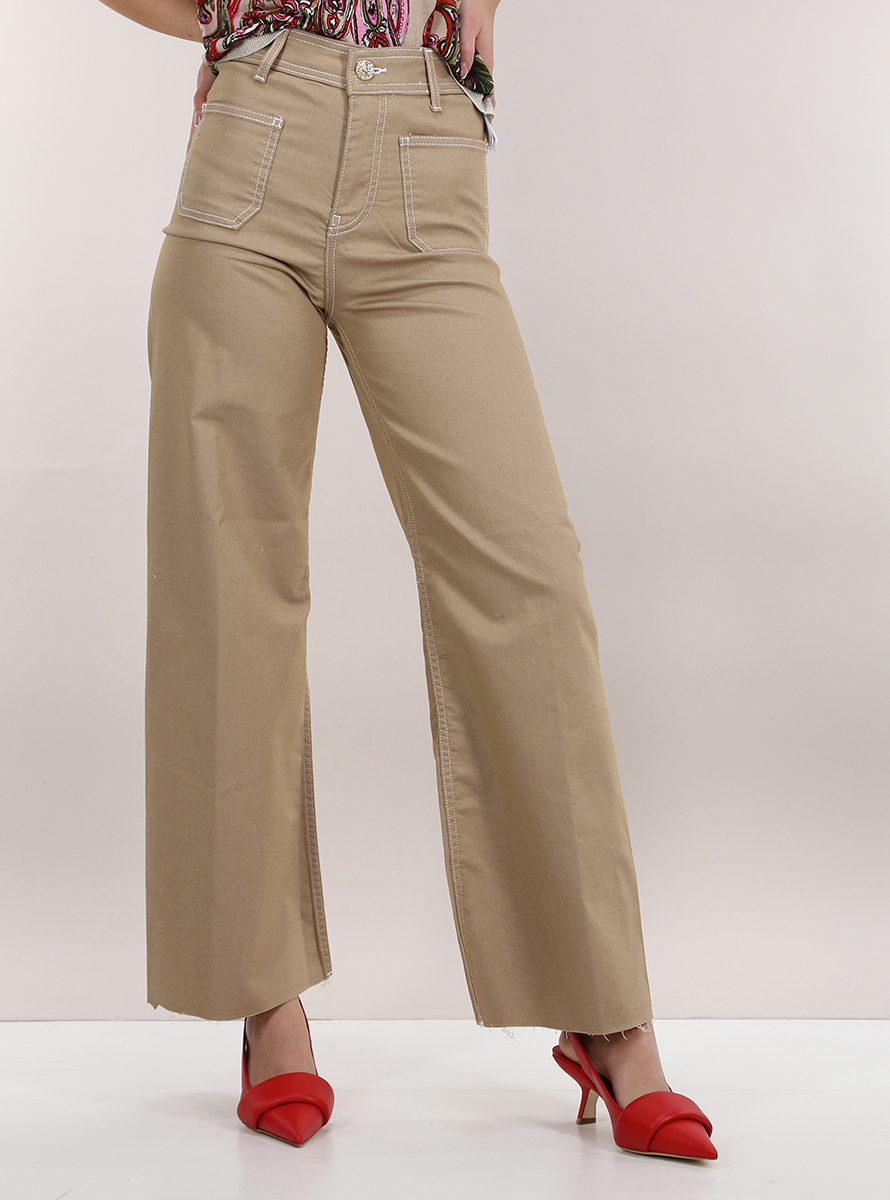 Liu.Jo Palazzo-Jeans aus elastischer Baumwolle. Hohe Taille mit aufgesetzten Taschen vorne und hinten. Juwelenverschlussknopf und roh geschnittener Boden. Das Model ist 1,70 groß und trägt Größe 26.