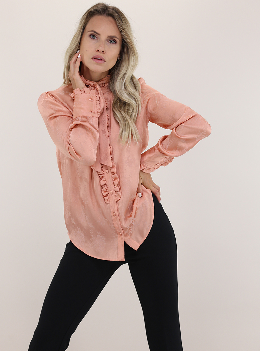 Aniye BY Hemd aus Seidenmischung. Lange Ärmel mit Manschetten und Stehkragen mit Schleife. Rüschenkanten. Blumenmuster Ton in Ton. Das Model ist 1,68 groß und trägt Größe 40.