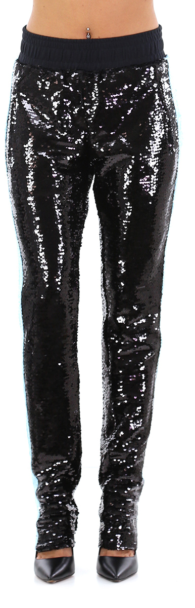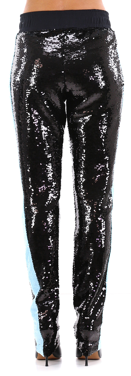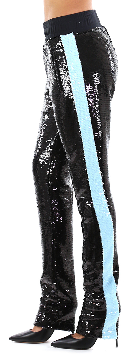 Paillettengefütterte Hose mit seitlichem Kontrastband. Beuteltaschen vorne mit Reißverschluss. Elastische Taille. Das Model ist 1,68 groß und trägt Größe S.