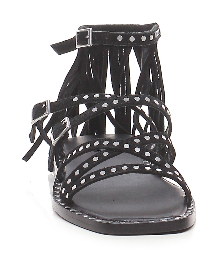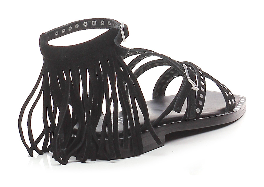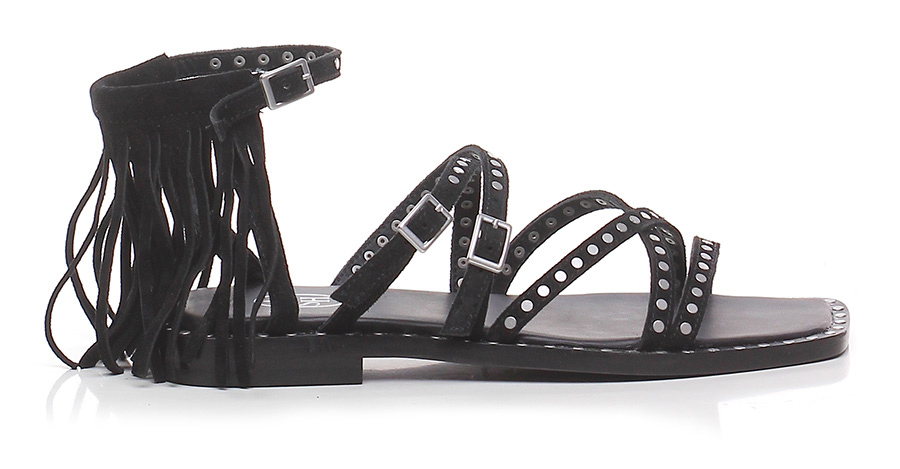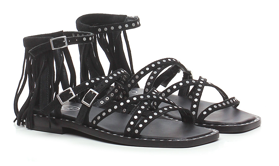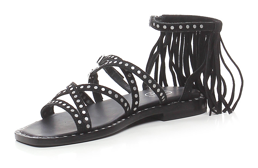 Flache Wildledersandale mit Doppelriemen, Ledersohle. Absatz 20. Fransen hinten und Nietenapplikationen am Sohlen- und Schaftrand.
