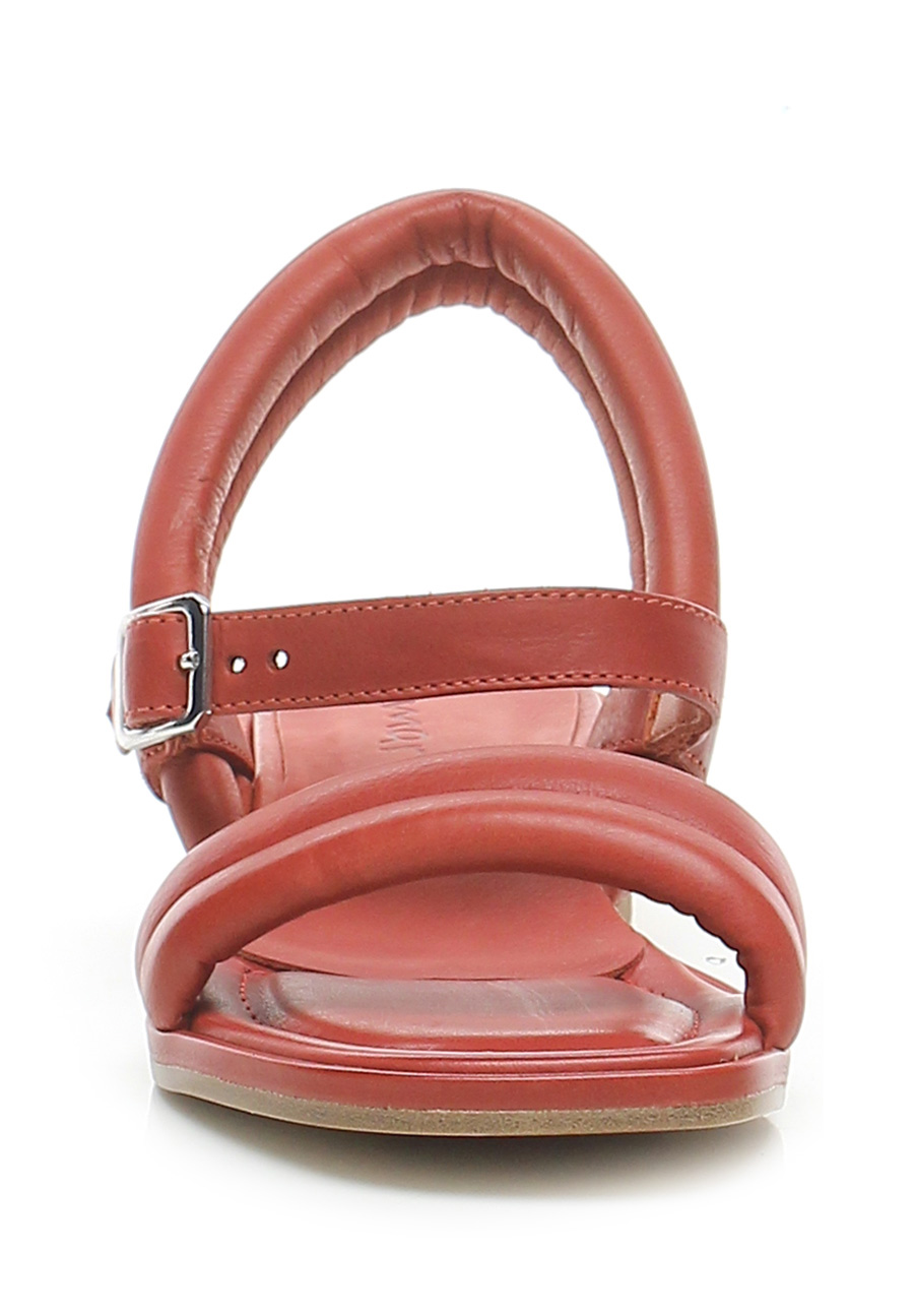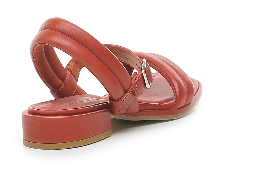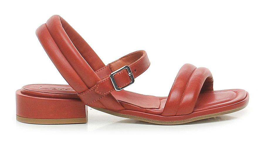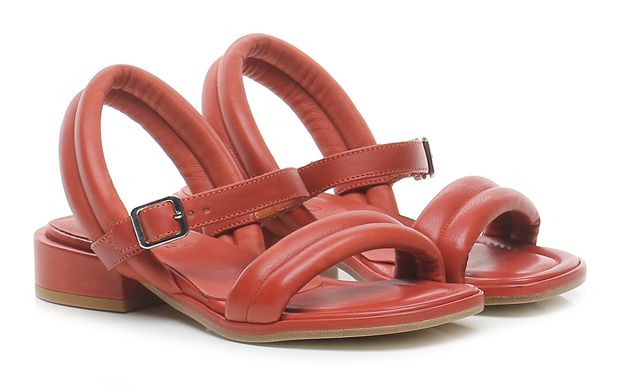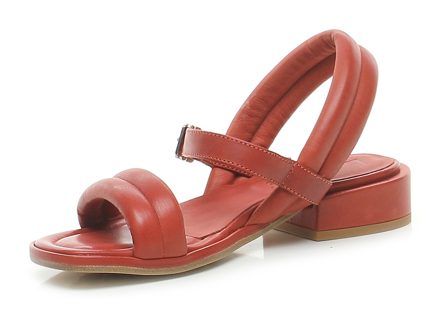 Niedrige Sandale aus gepolstertem Leder mit Knöchelriemen, Sohle und Gummi. Absatz 35, mit Leder überzogen.