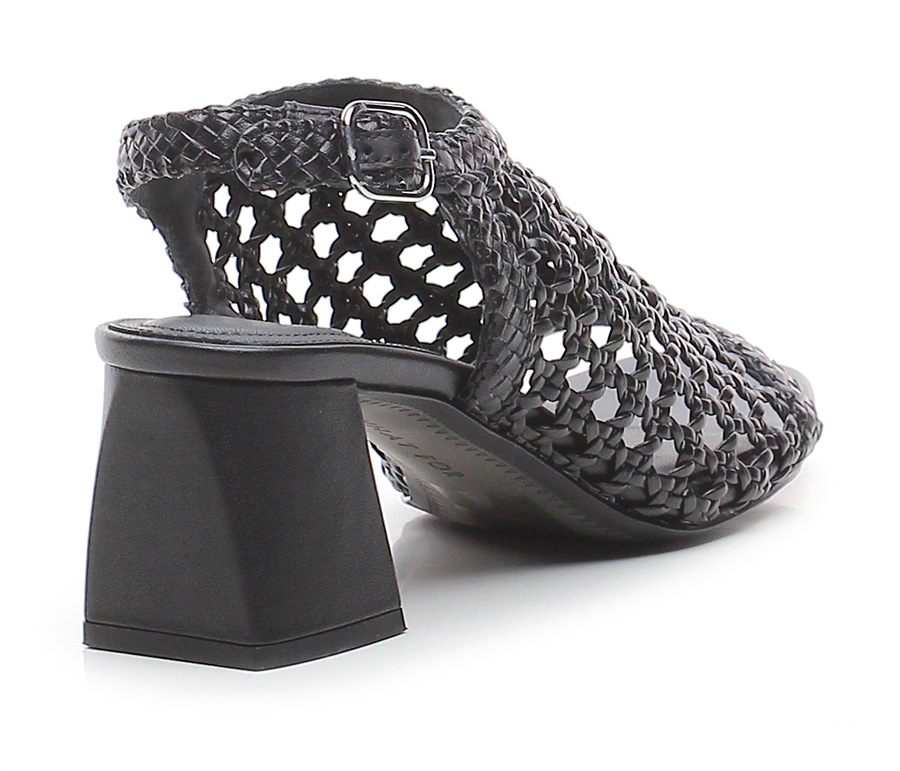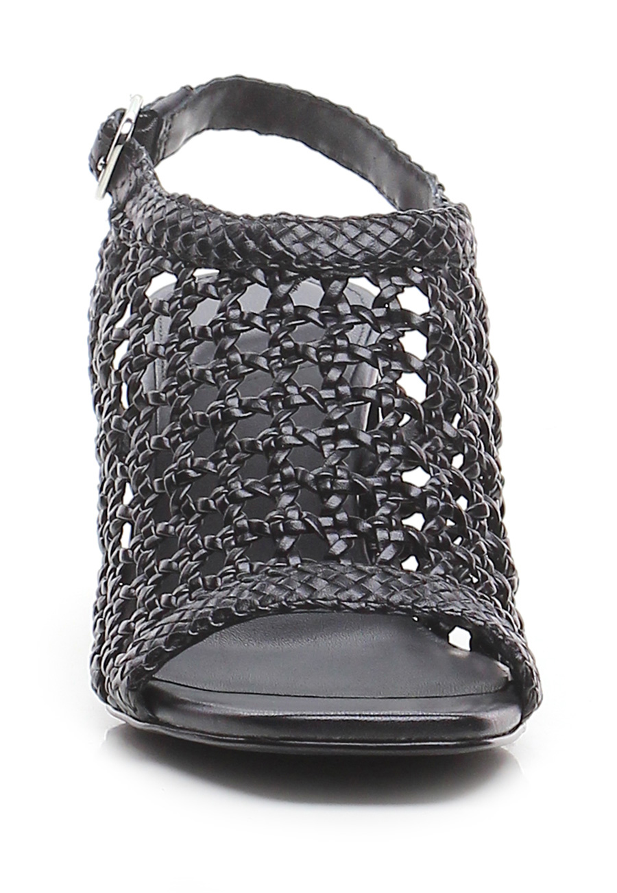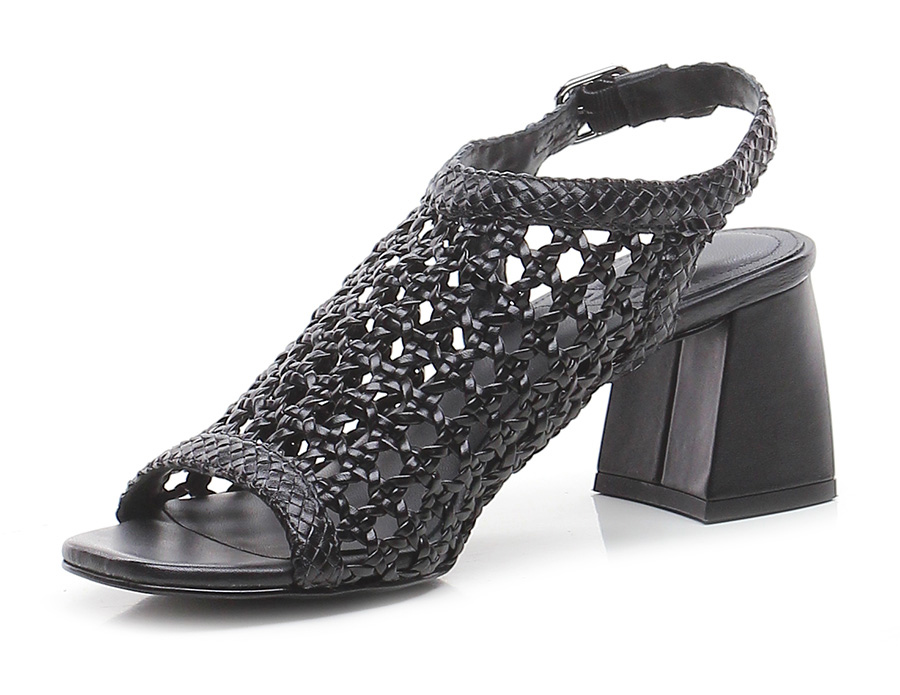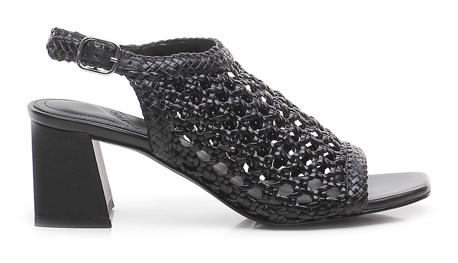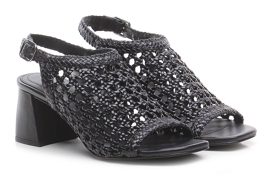 Hohe Sandale aus gewebtem Kunstleder mit Riemen auf der Rückseite, Gummisohle. Absatz 65, mit Kunstleder überzogen.