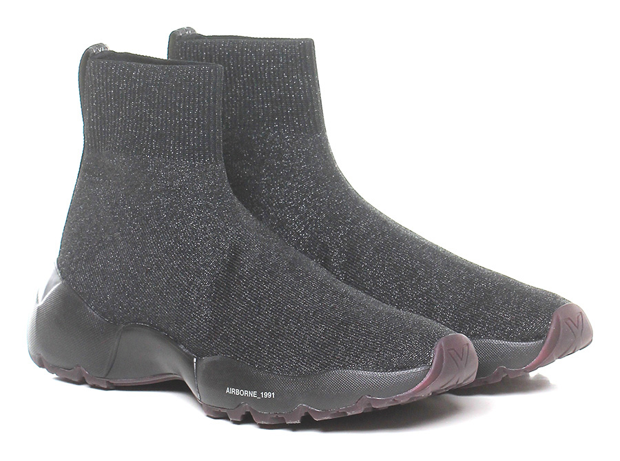 Sneaker in tessuto effetto laminato con tomaia elasticizzata e suola in gomma extra light. Tacco 45, platform 30 con battuta 15.