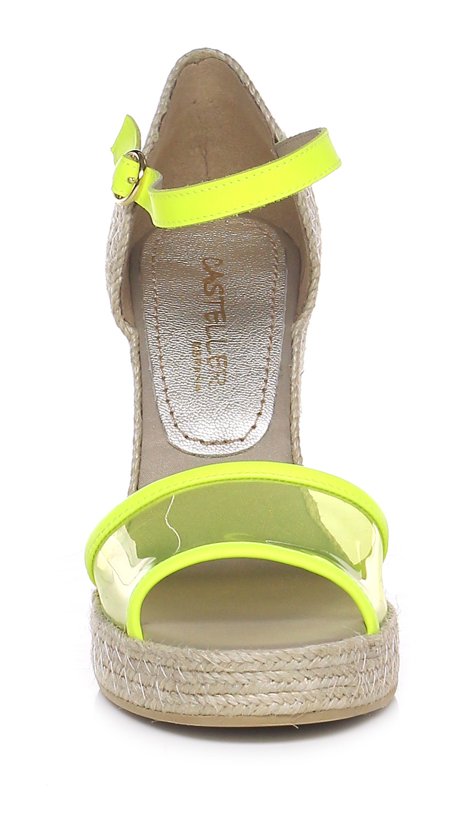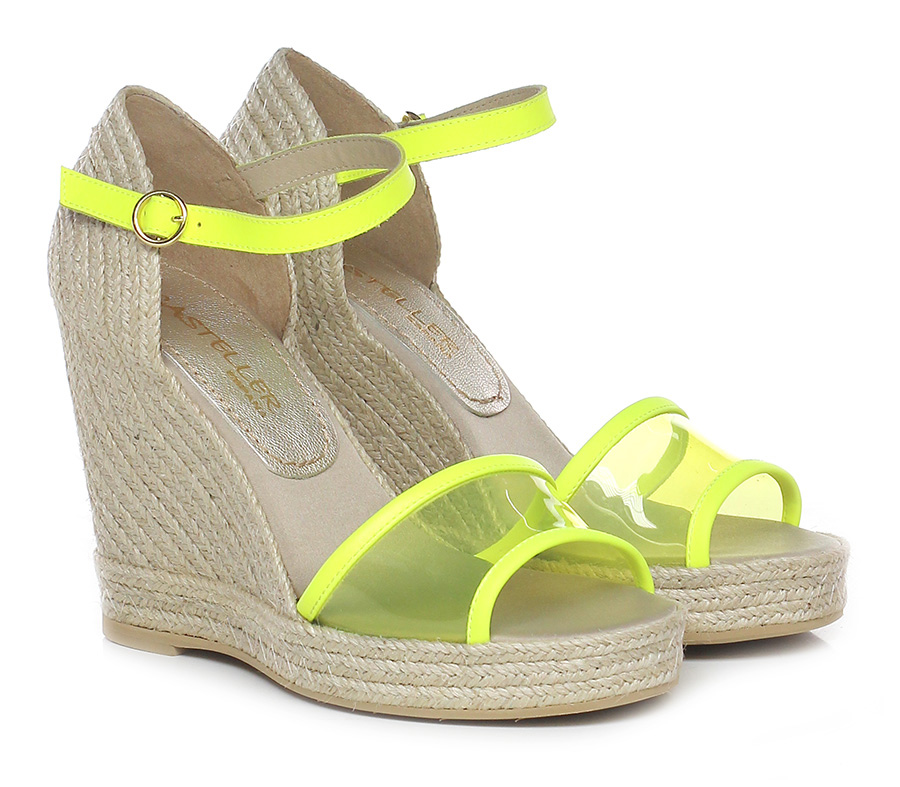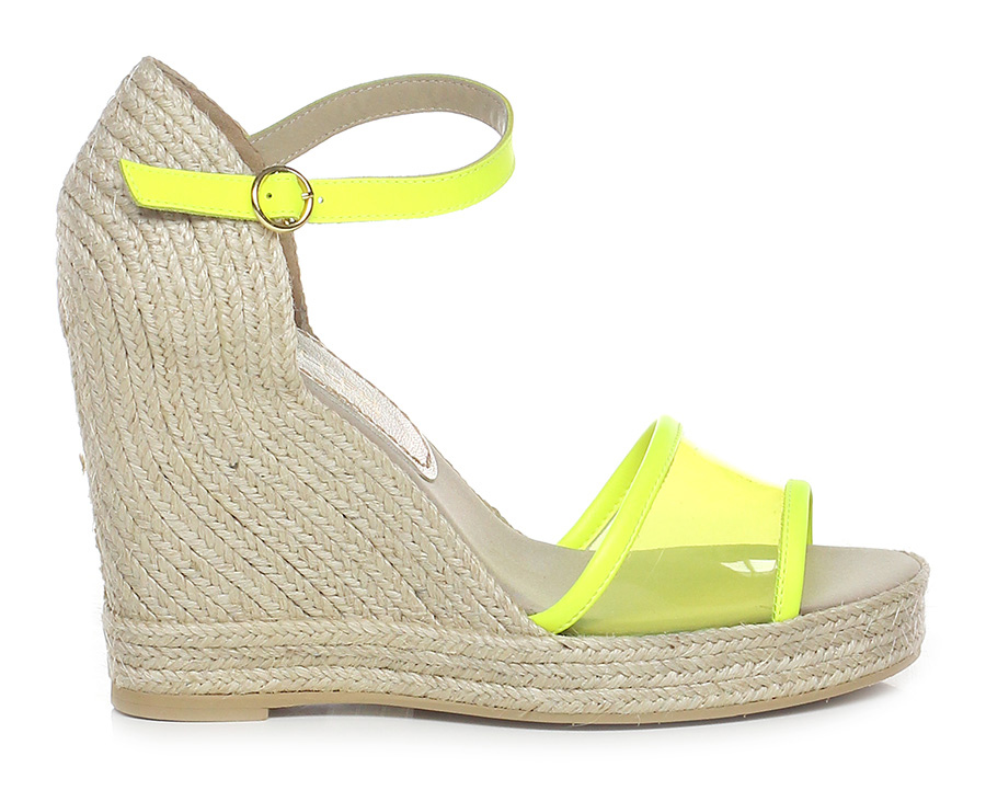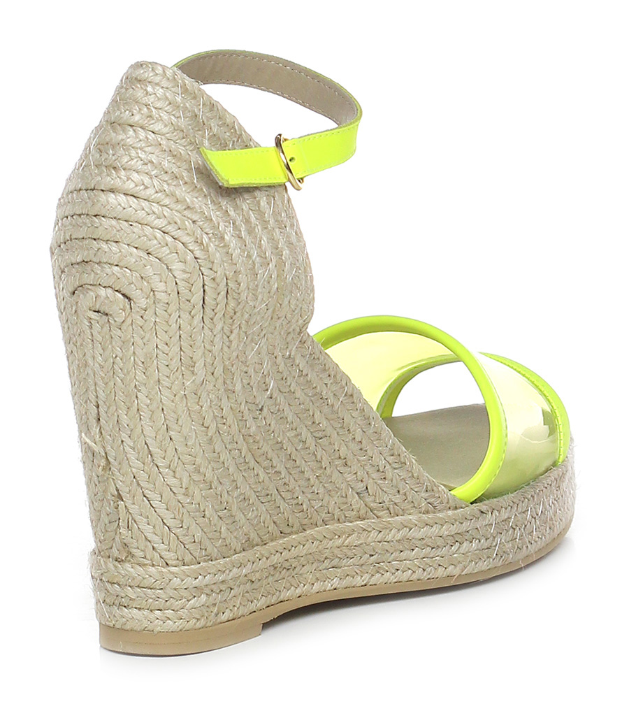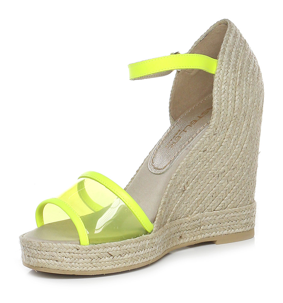Keilabsatz aus Leder in Gummioptik mit PVC-Einsätzen, Knöchelriemen, Gummisohle. Absatz 110, Plattform 25 mit Absatz 85. Keil mit Seil bedeckt.