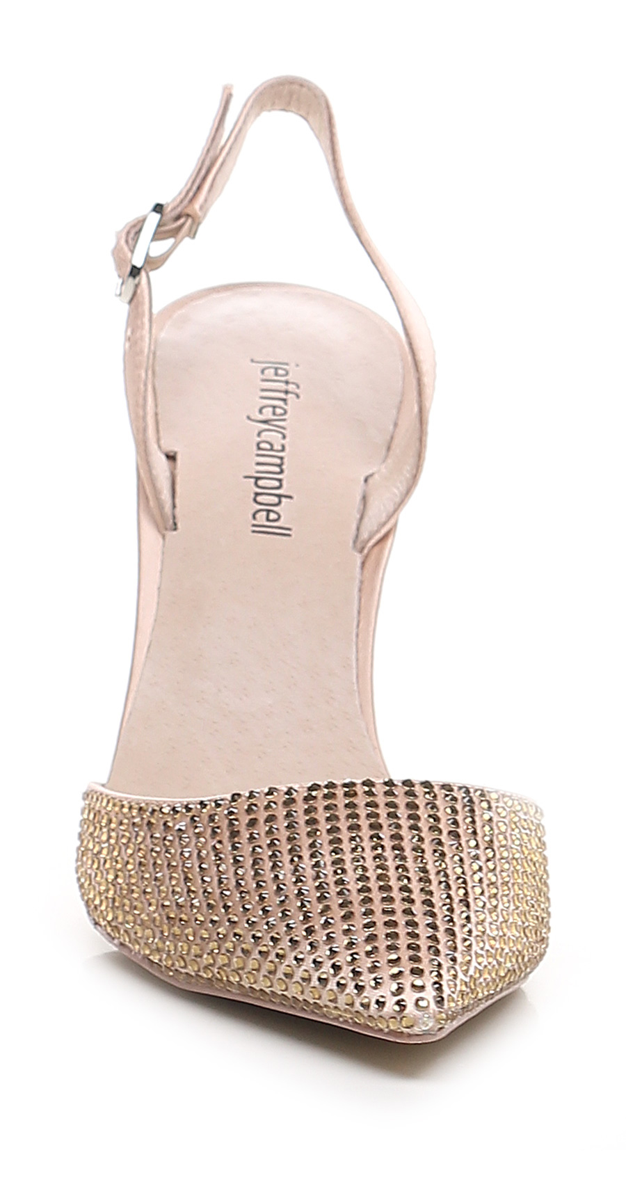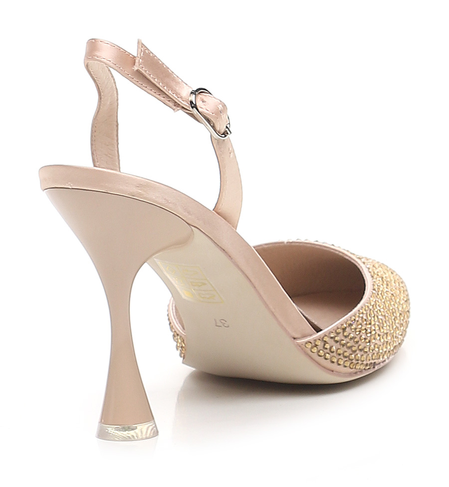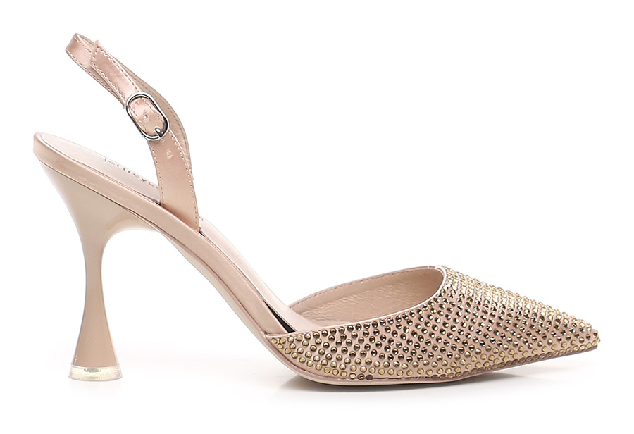 Fabric shoe with strap on the back. Rhinestones on the front. Rubber sole. Heel height 100mm. Shiny effect pvc heel.