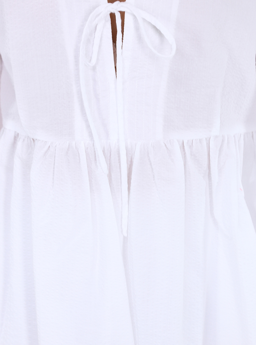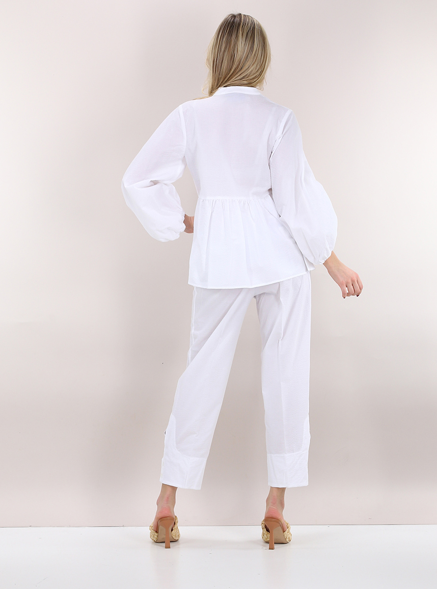 Soft Beatrice B sweater in cotton. Long wide sleeves with elastic and band collar with front closure laces. Ruffle gathered on the bottom. The model is 1.70 tall and wears size 38.