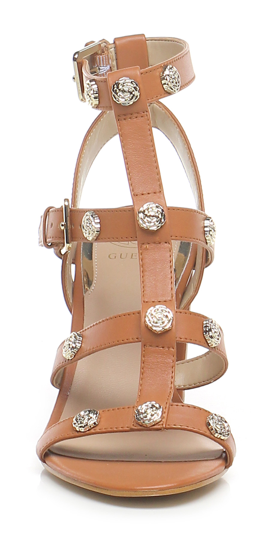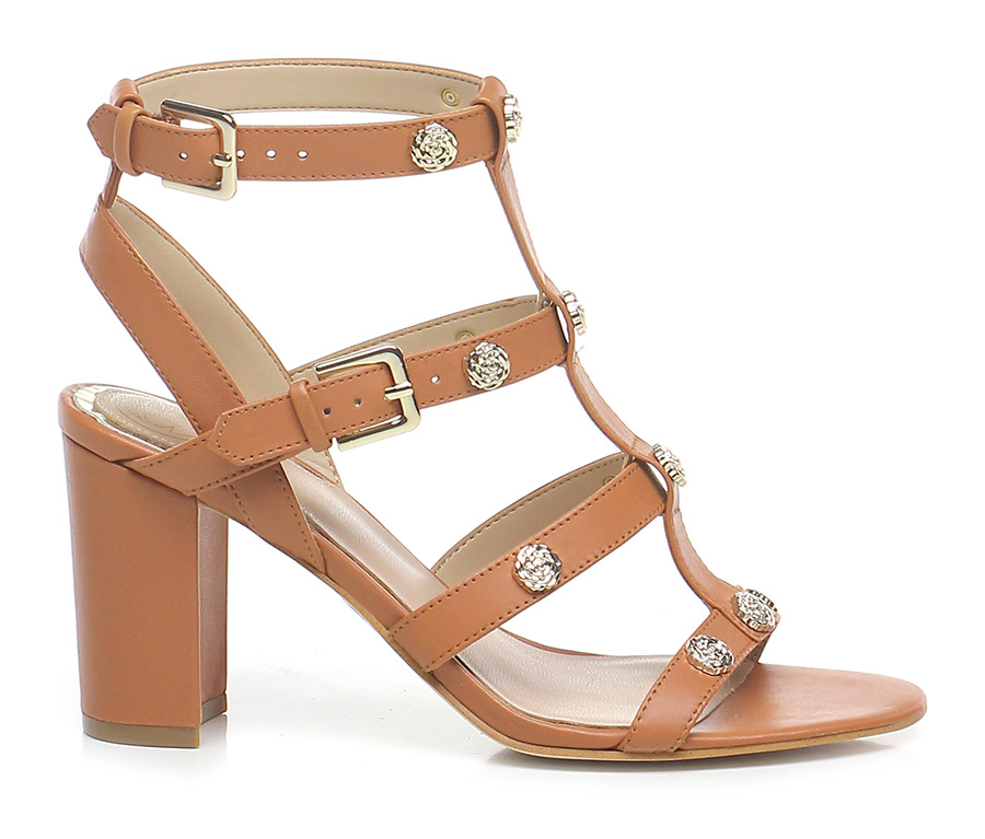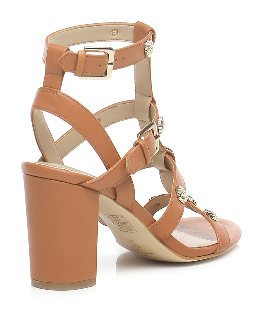 High leather sandal with applications on the upper and ankle strap, rubber sole. Heel 90, covered in leather.