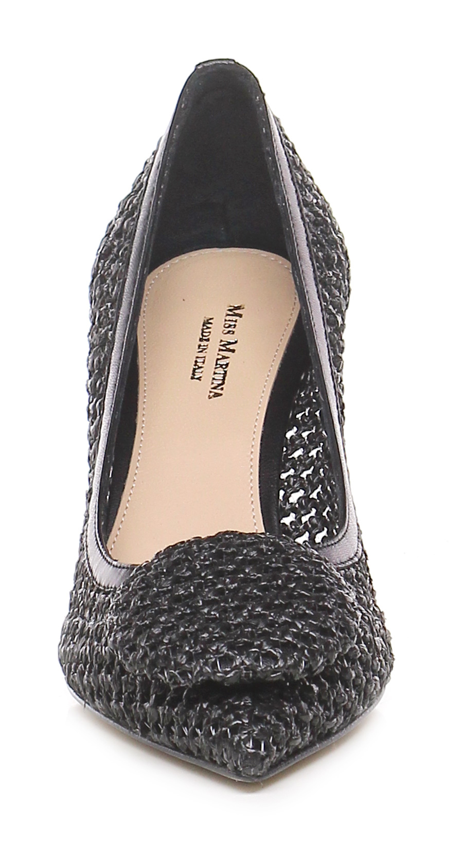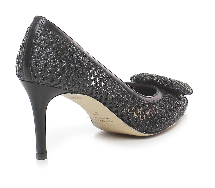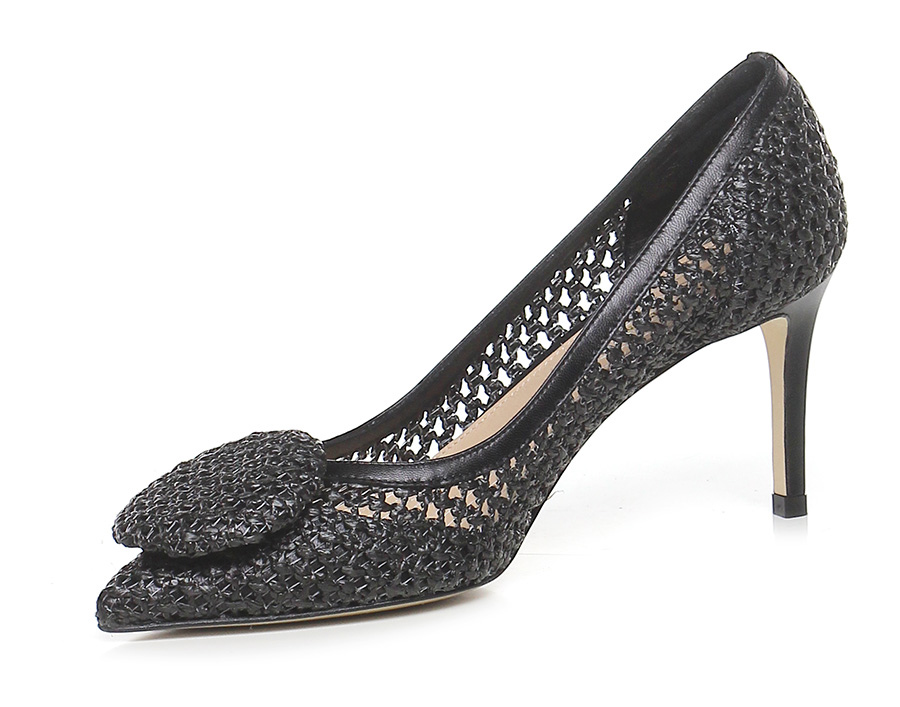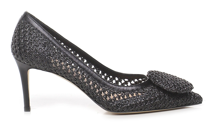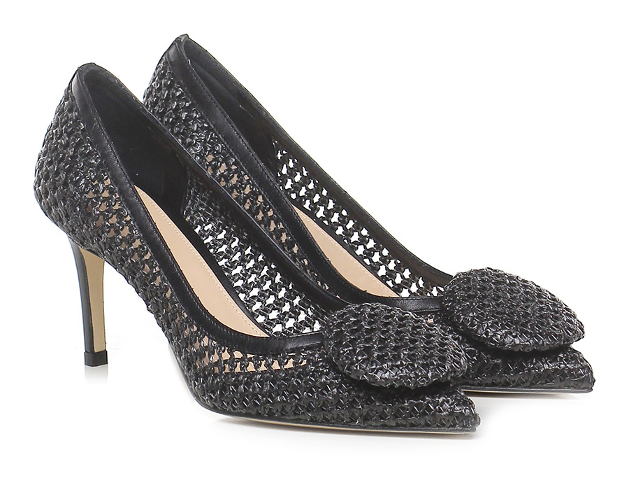 Shoe with heel in woven fabric and leather inserts, leather sole. Heel 85. Front accessory.