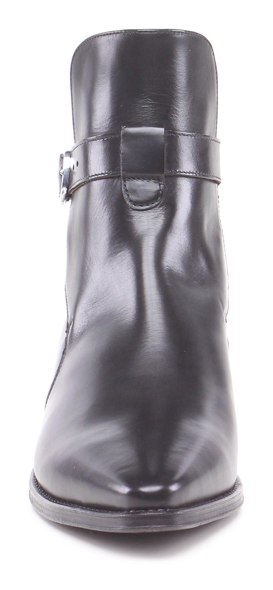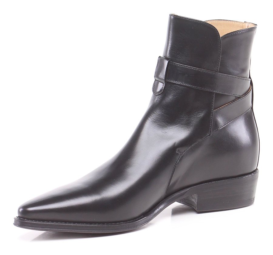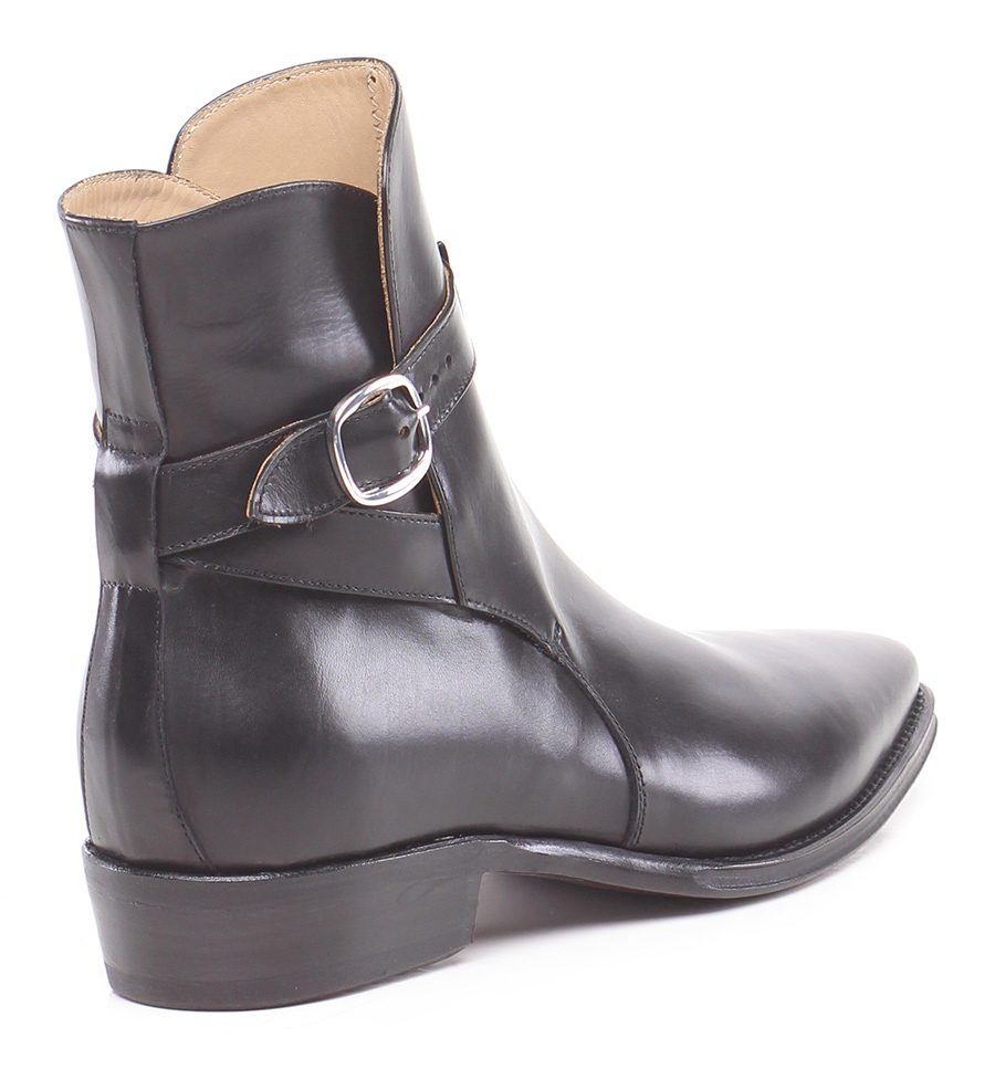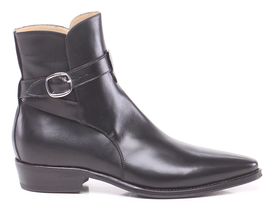 Leather ankle boot with strap and buckle on the outside, leather sole. 35 heel.