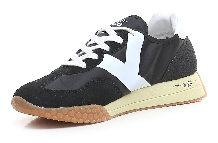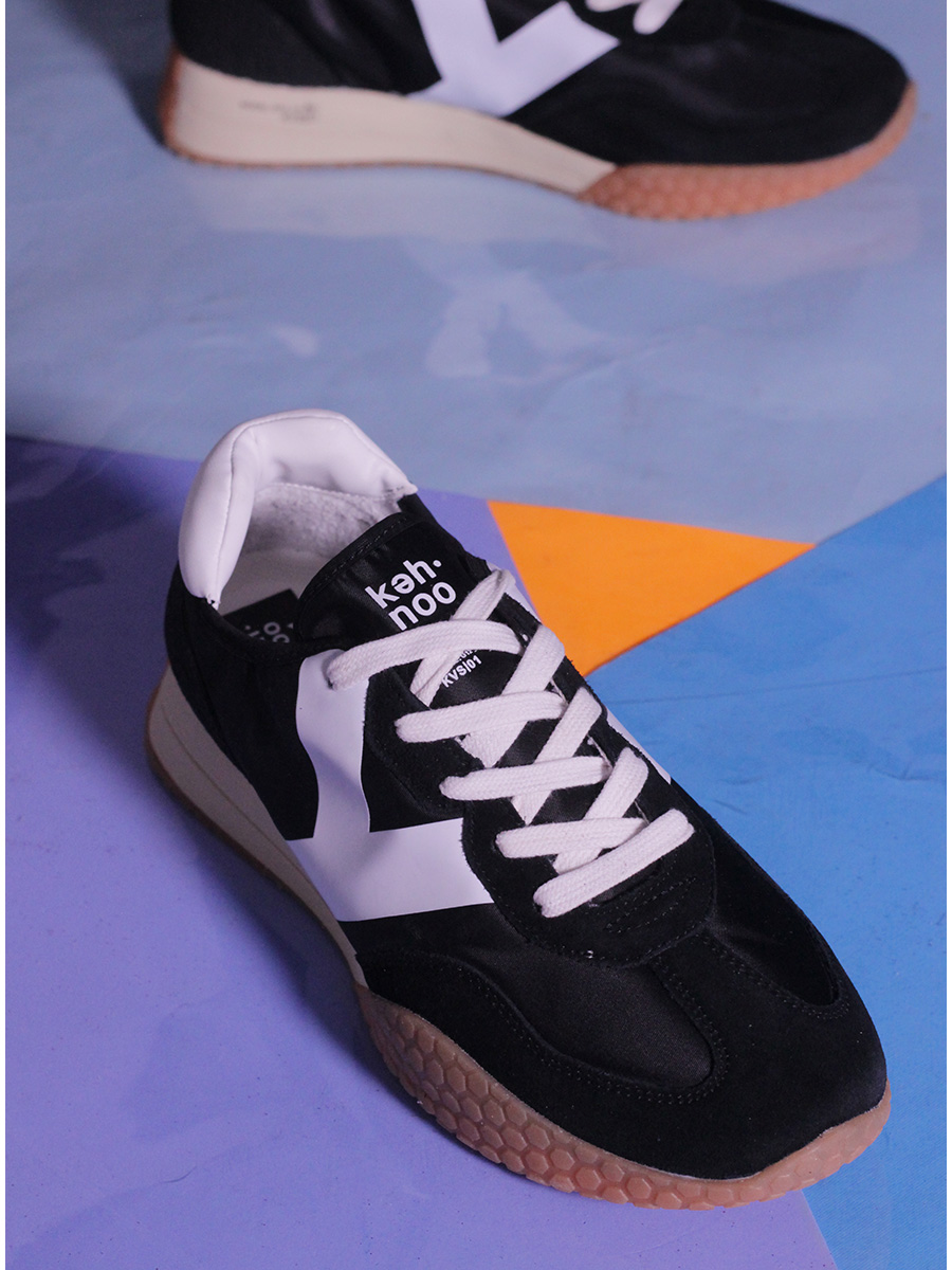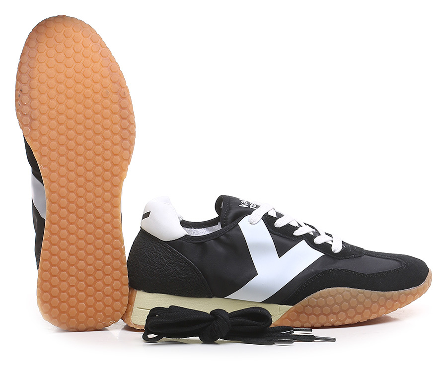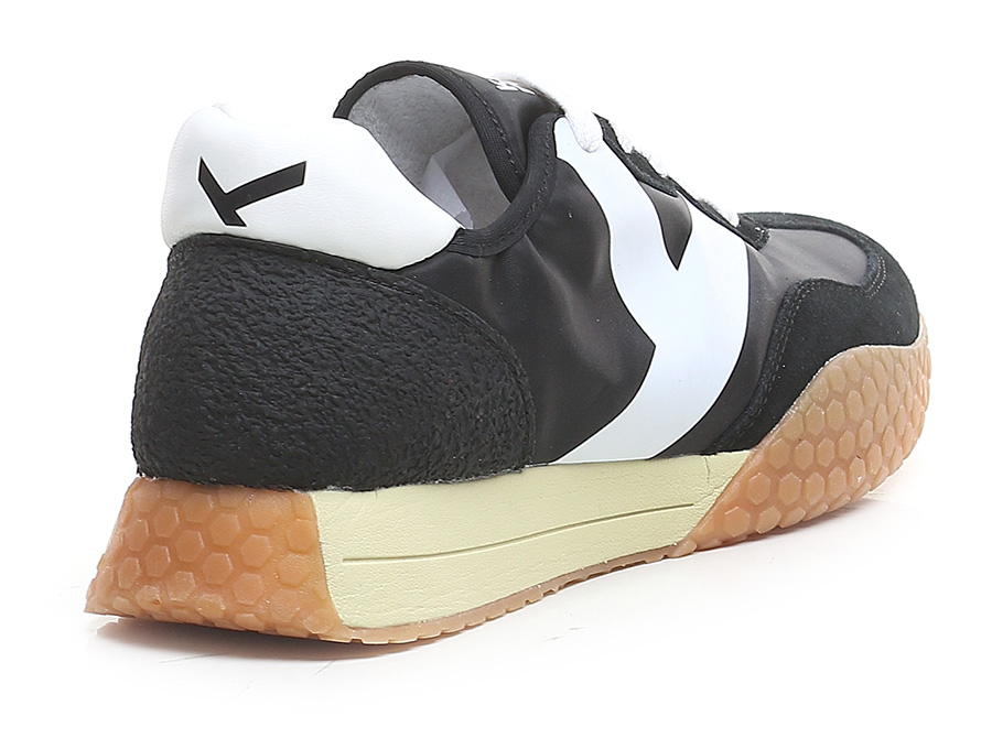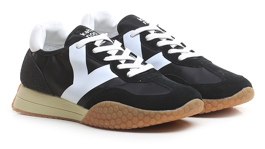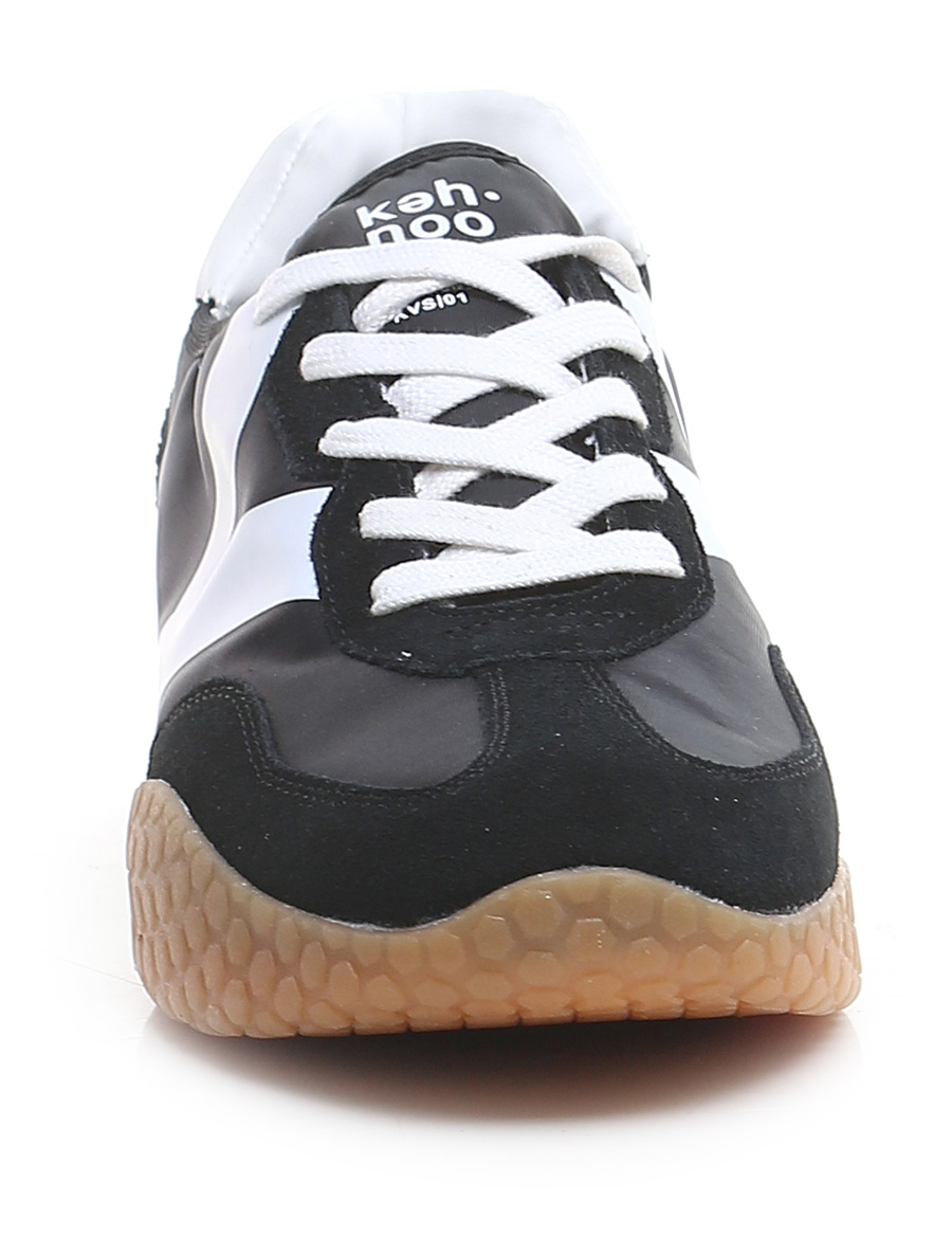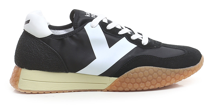 Sneaker in tessuto e camoscio con talloncino in pelle e inserto in pvc sul retro. Suola in gomma. Altezza tacco 30mm, platform 20mm con battuta 10mm.