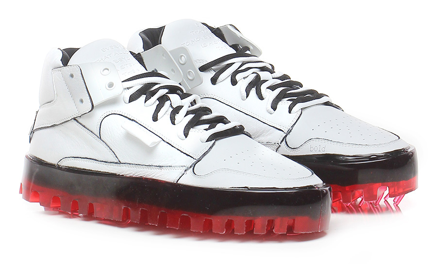 Leather sneaker with rubber inserts and tongue with embossed payoff, lug sole created using transparent liquid material in a patented mold that is stimulated at high temperature. Sole height: 35, platform 35.