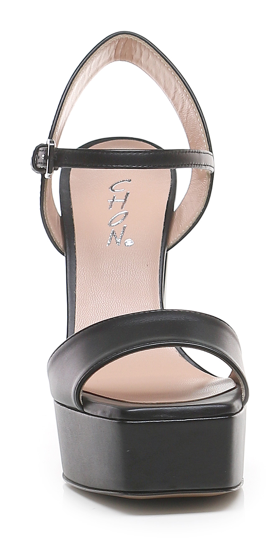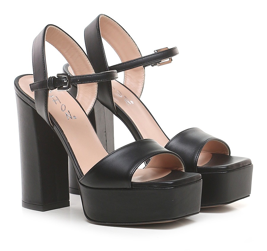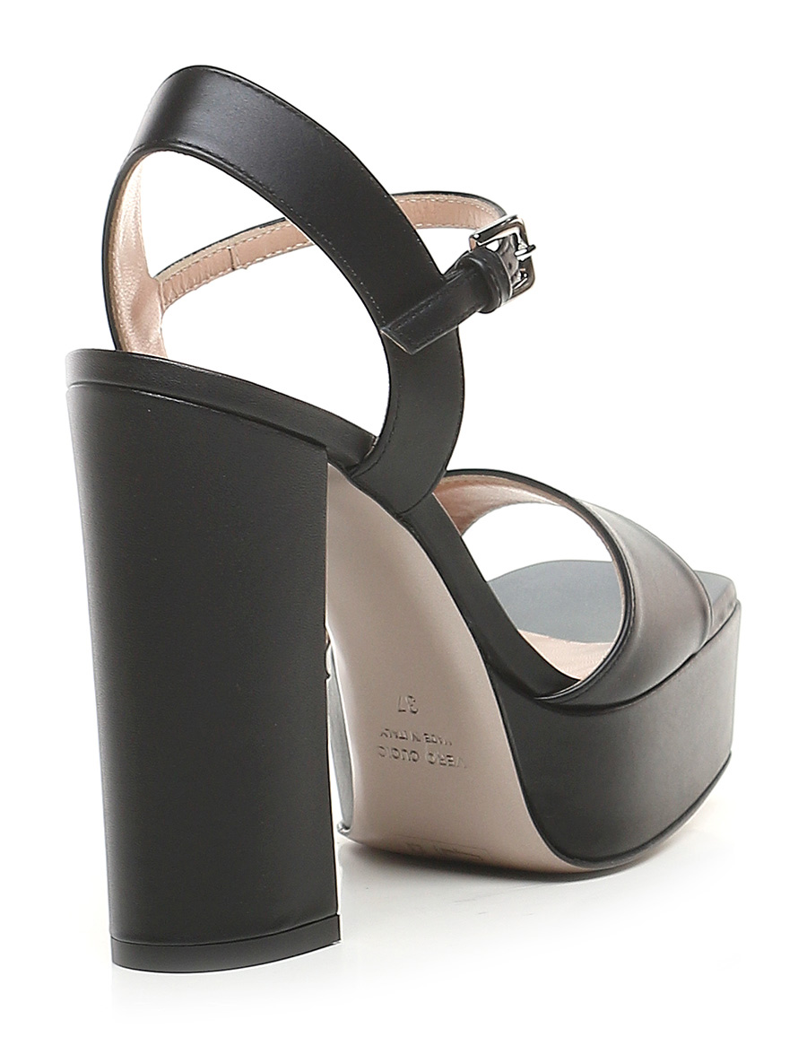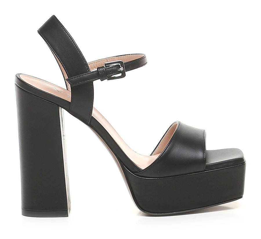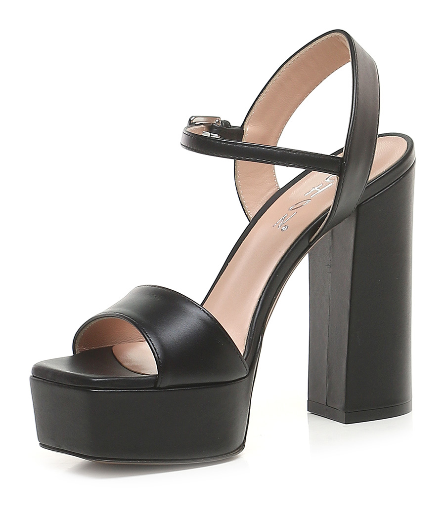 Leather sandal with ankle strap and leather sole. Heel height 130mm, platform 40mm with 90mm ledge.