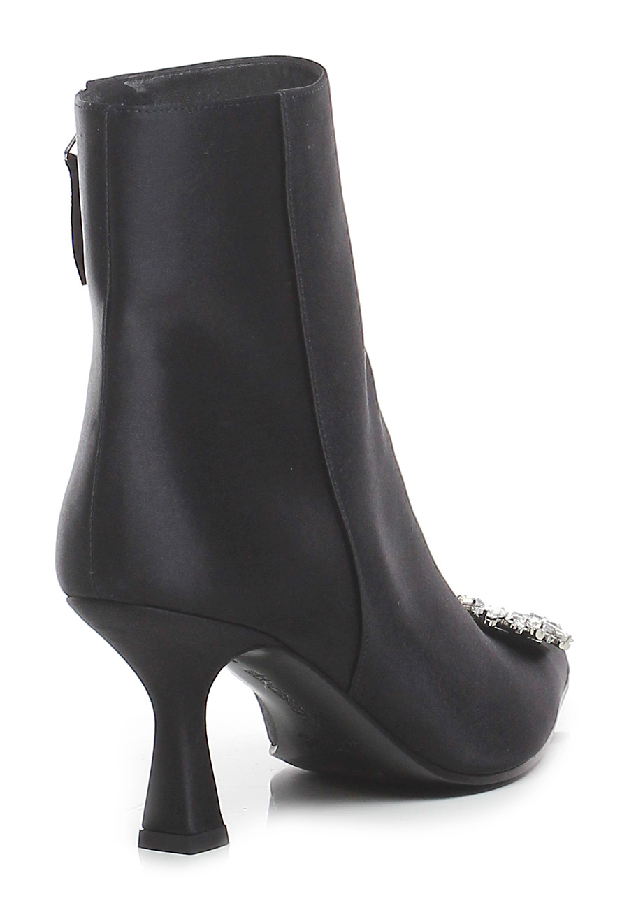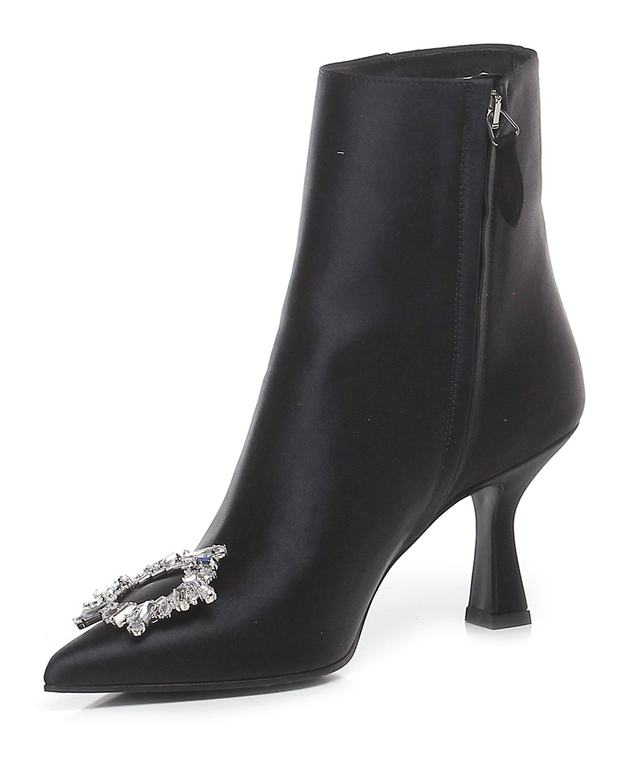 Satin ankle boot with internal side zip with front rhinestone application, leather and rubber sole. 75 heel.