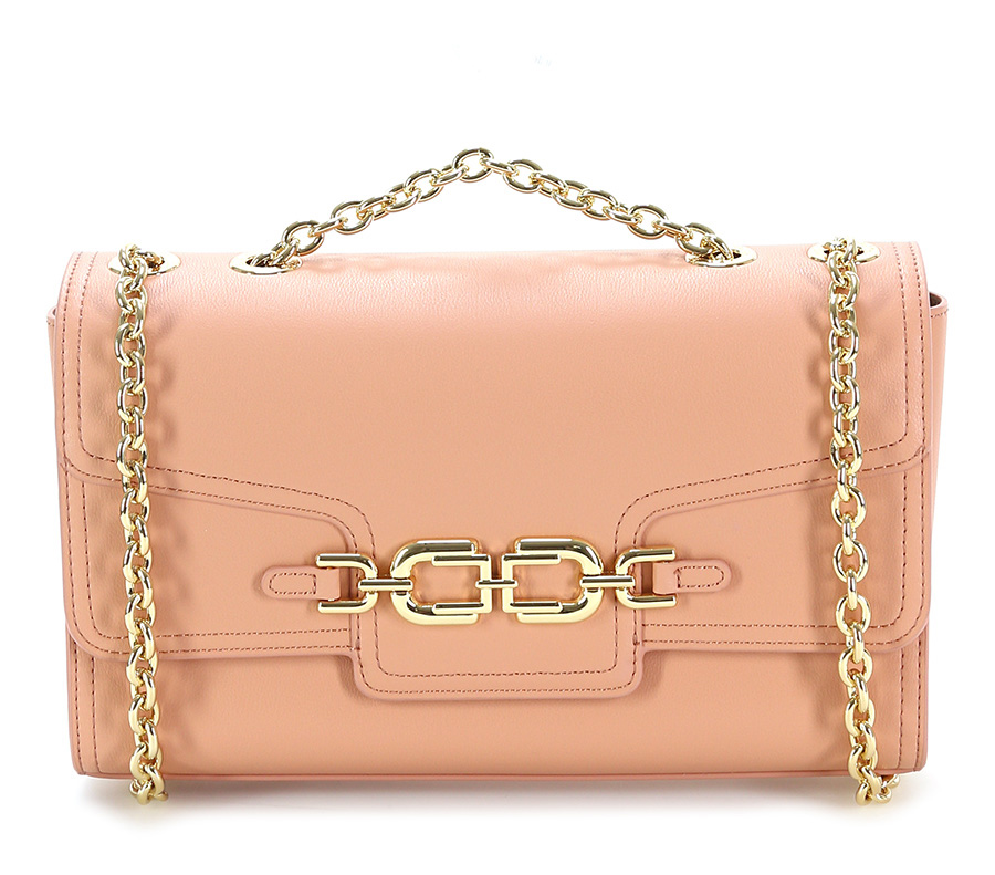 Borsa in eco pelle con bottone magnetico di chiusura. Tracolla in metallo inclusa. Misure 27 x 17 cm. Dettagli gold.