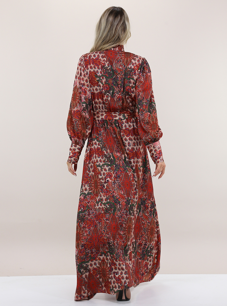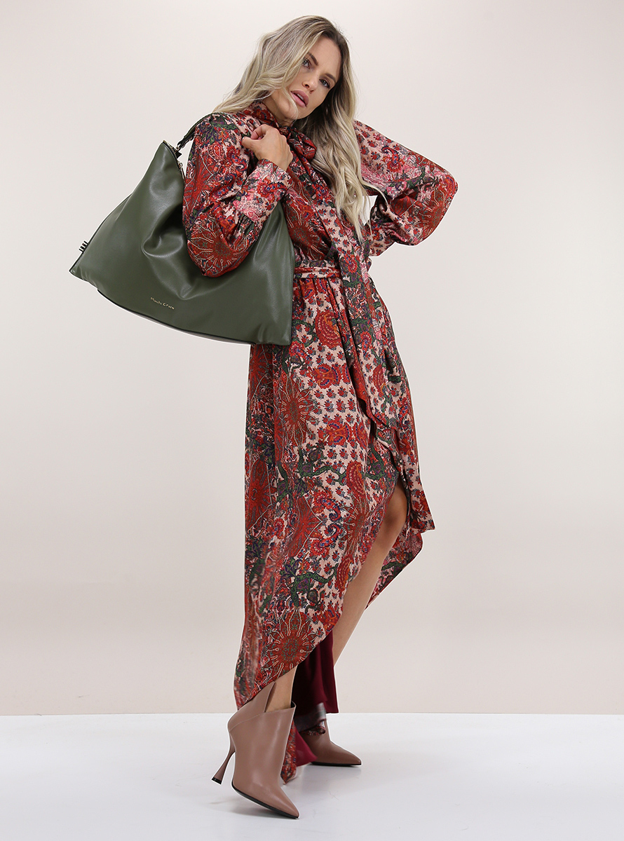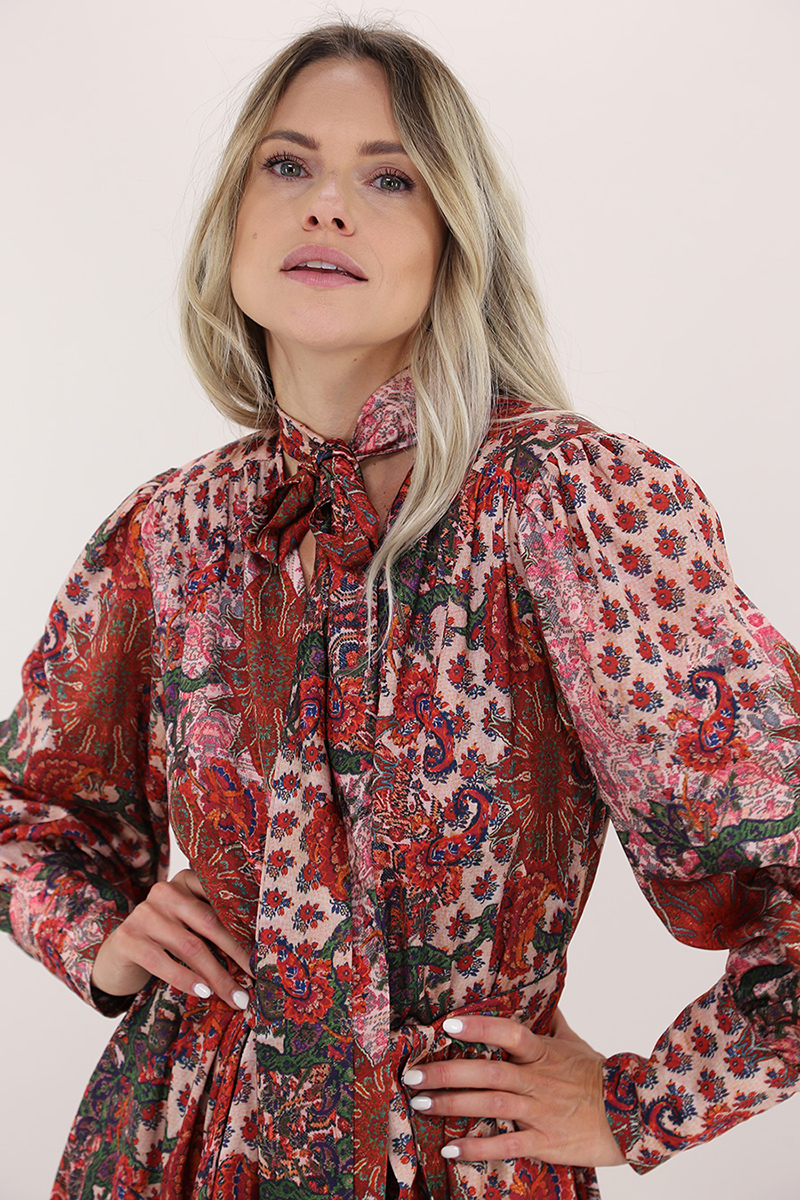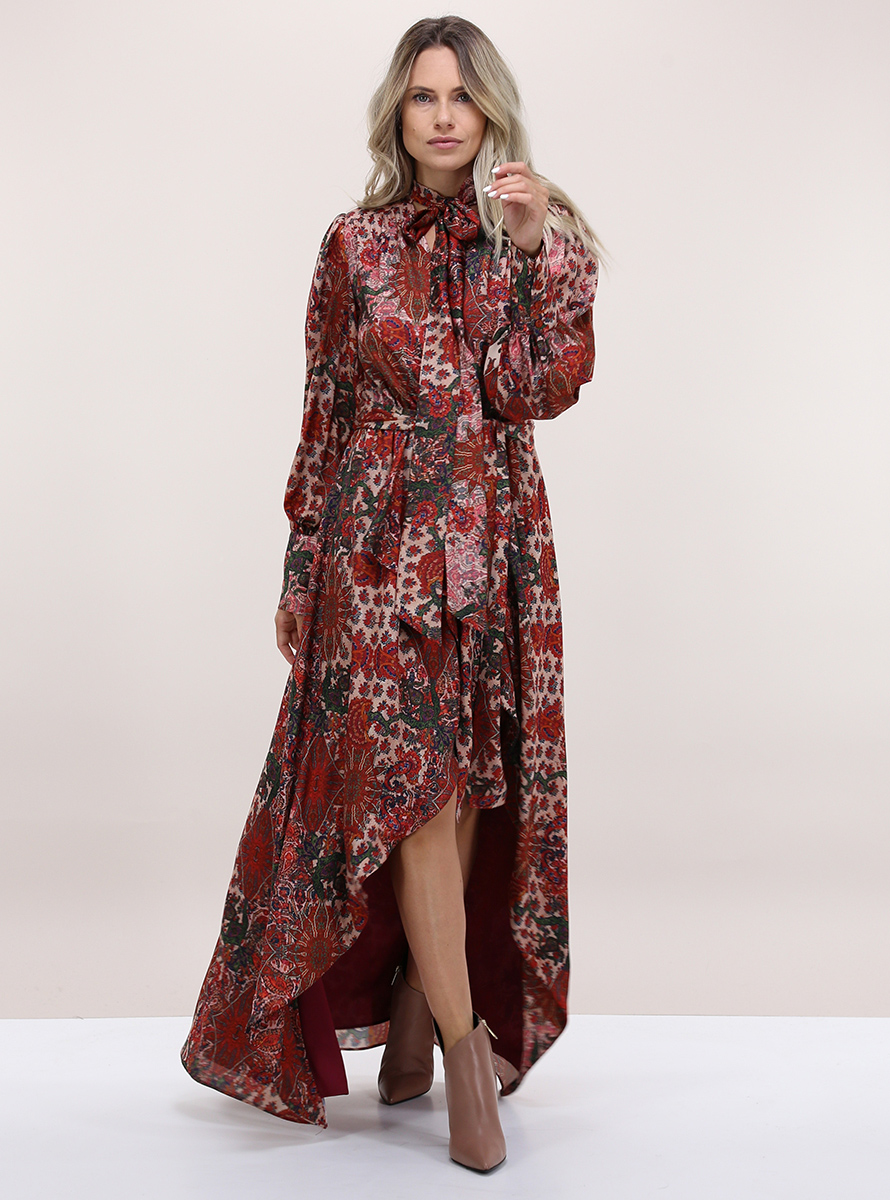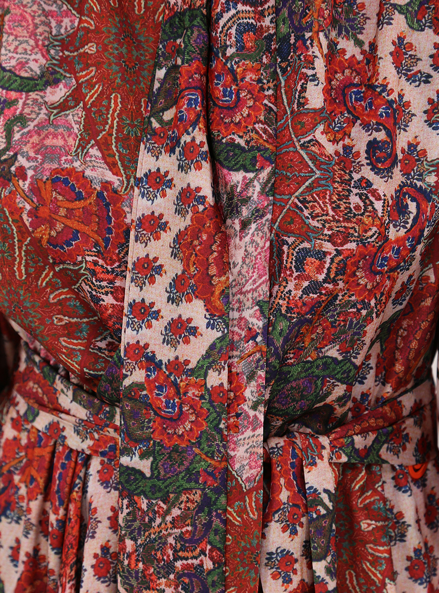 Gaelle Paris lined wrap dress. Long sleeves with padded cuffs and shoulders. V-neck with bow. Elastic waist with fabric belt included. Asymmetrical bottom. Multicolor jacquard pattern. The model is 1.68 tall and wears size 40.