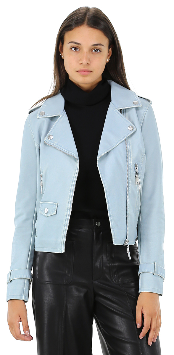 Chiodo in ecopelle, foderato, maniche lunghe. Zip di chiusura e delle tasche silver. La modella è alta 1,80 ed indossa la taglia XS.