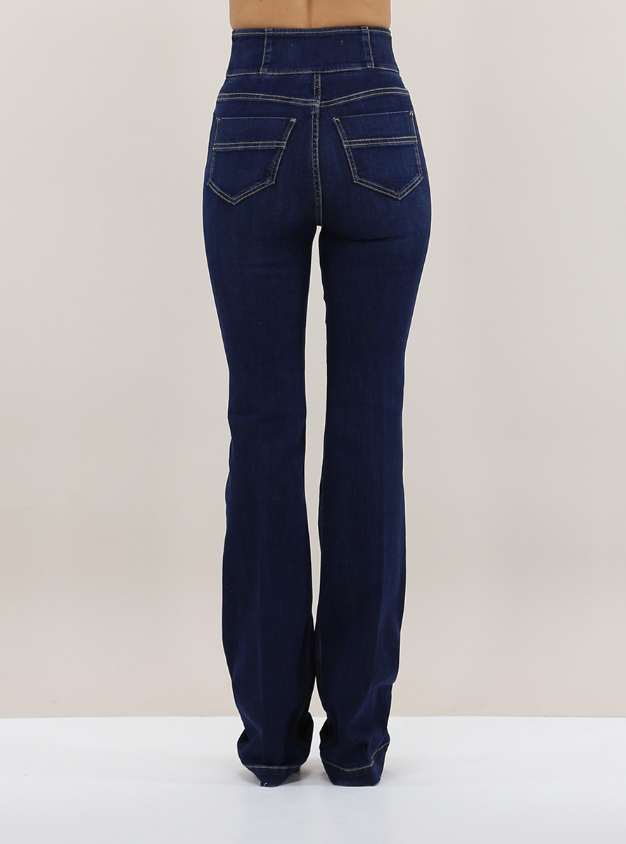 Elisabetta Franchi flared jeans in stretch cotton denim. High waist and gold logoed snap closures. The model is 1.68 tall and wears size 26.