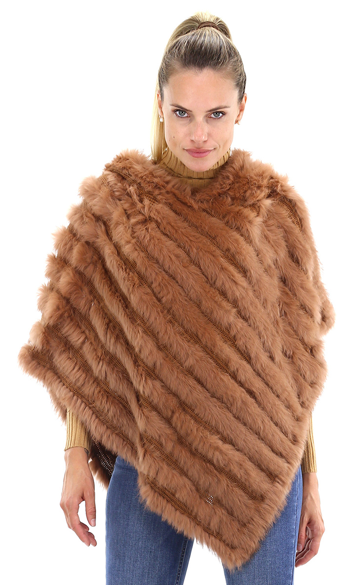 Poncho con inserti real fur con cappuccio. Fondo asimmetrico. La modella è alta 1,68 cm ed indossa la taglia UNICA.