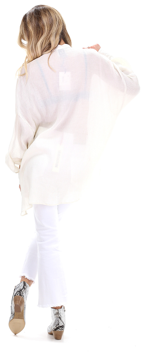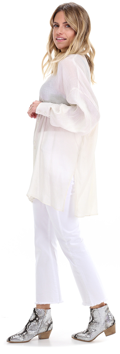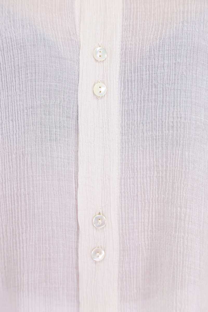 Box shirt in viscose blend with long sleeves and round neck with band. Slits on the bottom and embossed workmanship. The model is 1.68 tall and wears size 38.